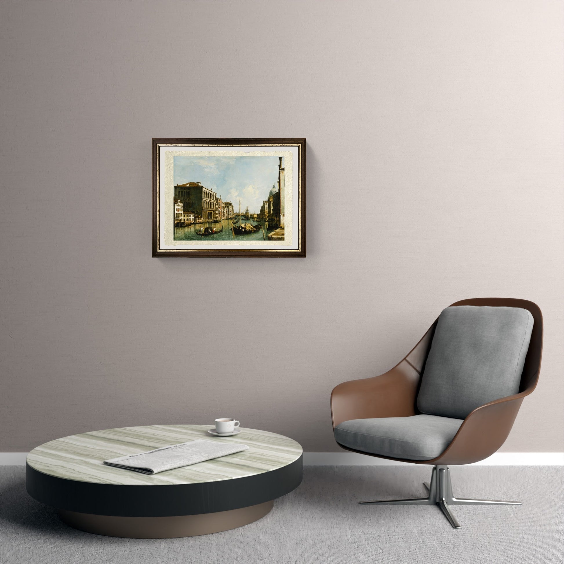 Originale e rara settecentesca veduta del Canal Grande con vista dal Campo S. Vio, realizzata da Giovanni Antonio Canal detto Canaletto. In primo piano il Canal Grande, solcato da imbarcazioni di varia grandezza. L'acqua è stata dipinta dal Canal con sfumature verde chiaro azzurro. Sul Canal Grande si affacciano i palazzi veneziani. Il cielo è leggermente nuvoloso, sfumato con azzurro chiaro e bianco per le nuvole. Il quadro, un olio su tela, non è datato. Esistono altre varianti create dal Canaletto di quest'opera.