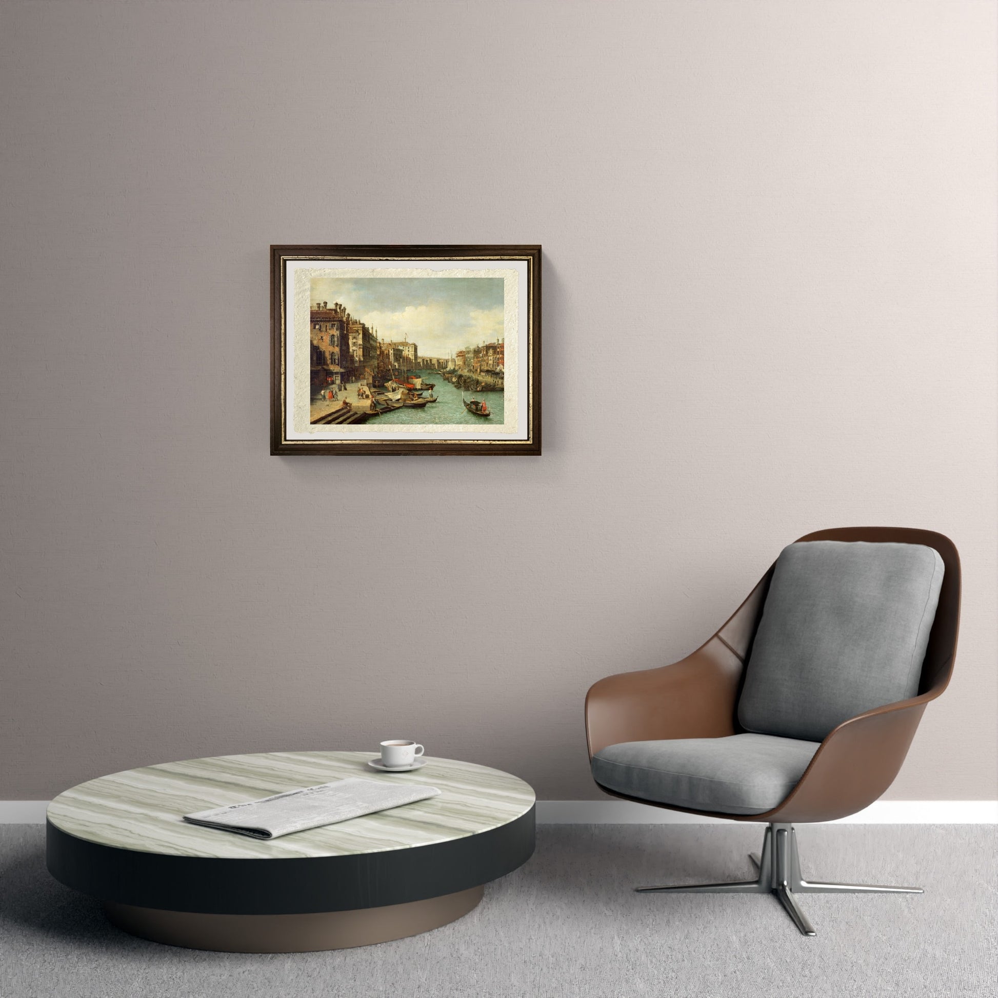 Originale e rara settecentesca veduta del Canal Grande con vista da Ponte Rialto, realizzata da Giovanni Antonio Canal detto Canaletto. In primo piano il Canal Grande, solcato da imbarcazioni di varia grandezza. L'acqua è stata dipinta dal Canal con sfumature verde chiaro azzurro. Sul Canal Grande si affacciano i palazzi veneziani. Il cielo è leggermente nuvoloso, sfumato con azzurro chiaro e bianco per le nuvole. Il quadro, un olio su tela, è datato circa 1730. Esistono altre varianti create dal Canal di quest'opera.