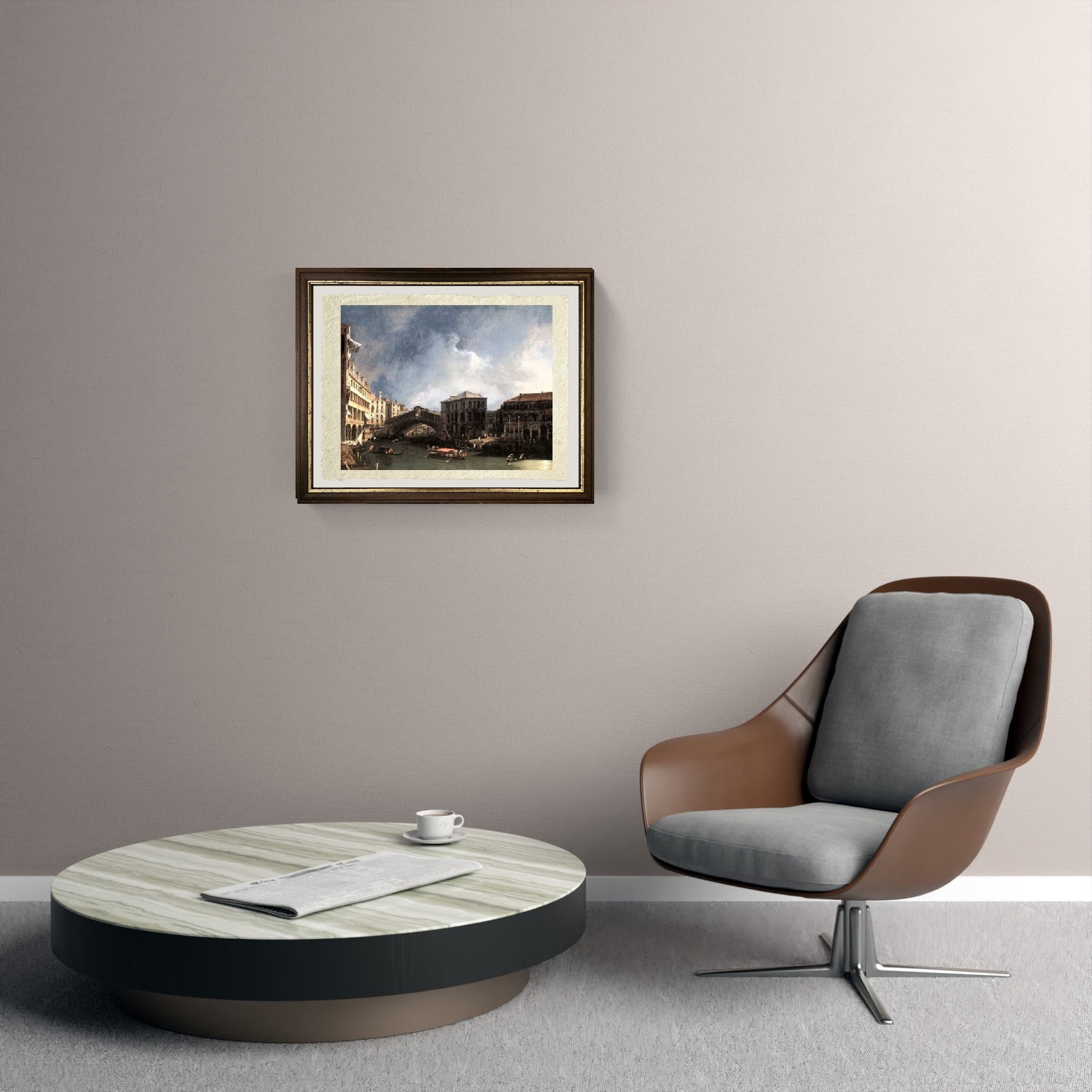 Originale e rara settecentesca veduta del Canal Grande con vista Ponte Rialto, realizzata da Giovanni Antonio Canal. In primo piano il Canal Grande, solcato da imbarcazioni di varia grandezza. L'acqua è stata dipinta dal Canal con sfumature verde chiaro azzurro. Particolare del riflesso del Sole sull'acqua, nel lato destro con alcuni palazzi "oscurati" dalle loro ombre. Il lato sinistro invece è ben illuminato dal Sole, mentre più sullo sfondo c'è Ponte Rialto. Il cielo è molto nuvoloso, sfumato con blu azzurro chiaro e bianco per le nuvole. Il quadro, un olio su tela, è datato 1725.