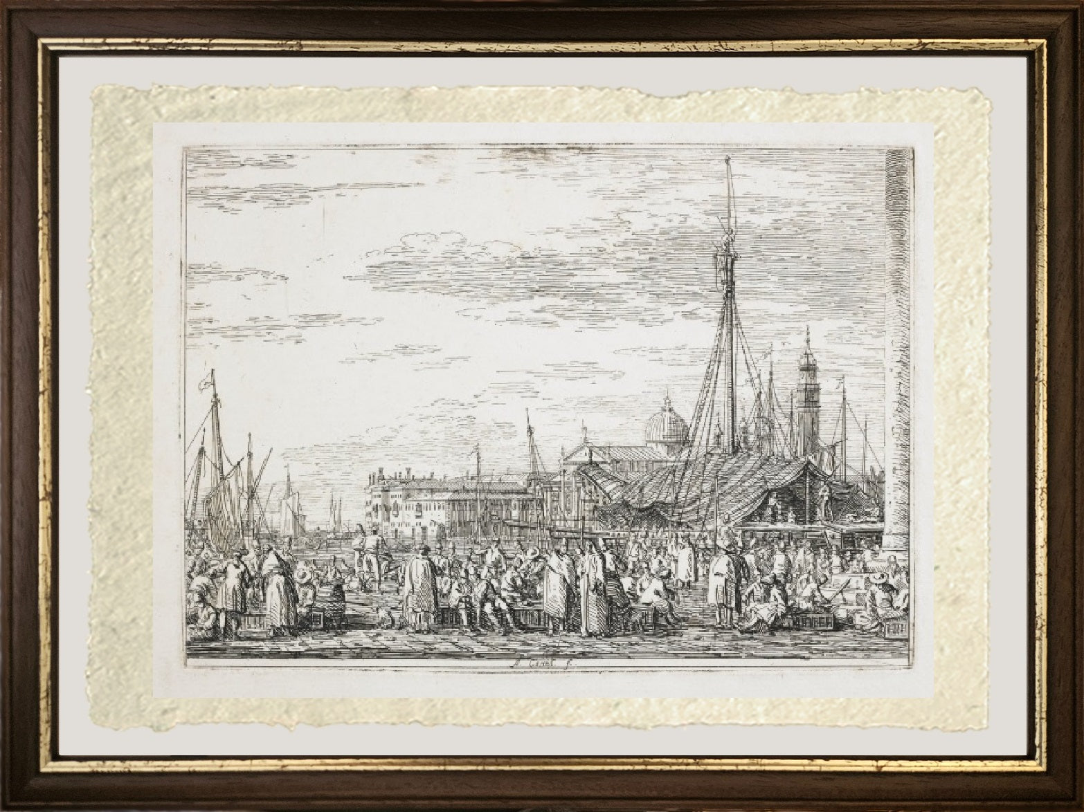 Originale e settecentesca incisione del molo di Venezia con dettaglio di approdo delle imbarcazioni, realizzata da Giovanni Antonio Canal detto Canaletto. Sulla piazzetta, antistante al Molo ci sono molte persone, intente nei loro commerci. Sullo sfondo vediamo un campanile ed una cupola di una chiesa e più verso sinistra dei palazzi veneziani. Le imbarcazioni sono ormeggiate ordinatamente, con i marinai che stanno facendo operazioni portuali. Il cielo è sereno, con qualche nuvola bianca all'orizzonte. L'incisione è datata 1740. Esistono numerose varianti create dal Canaletto di questa incisione.