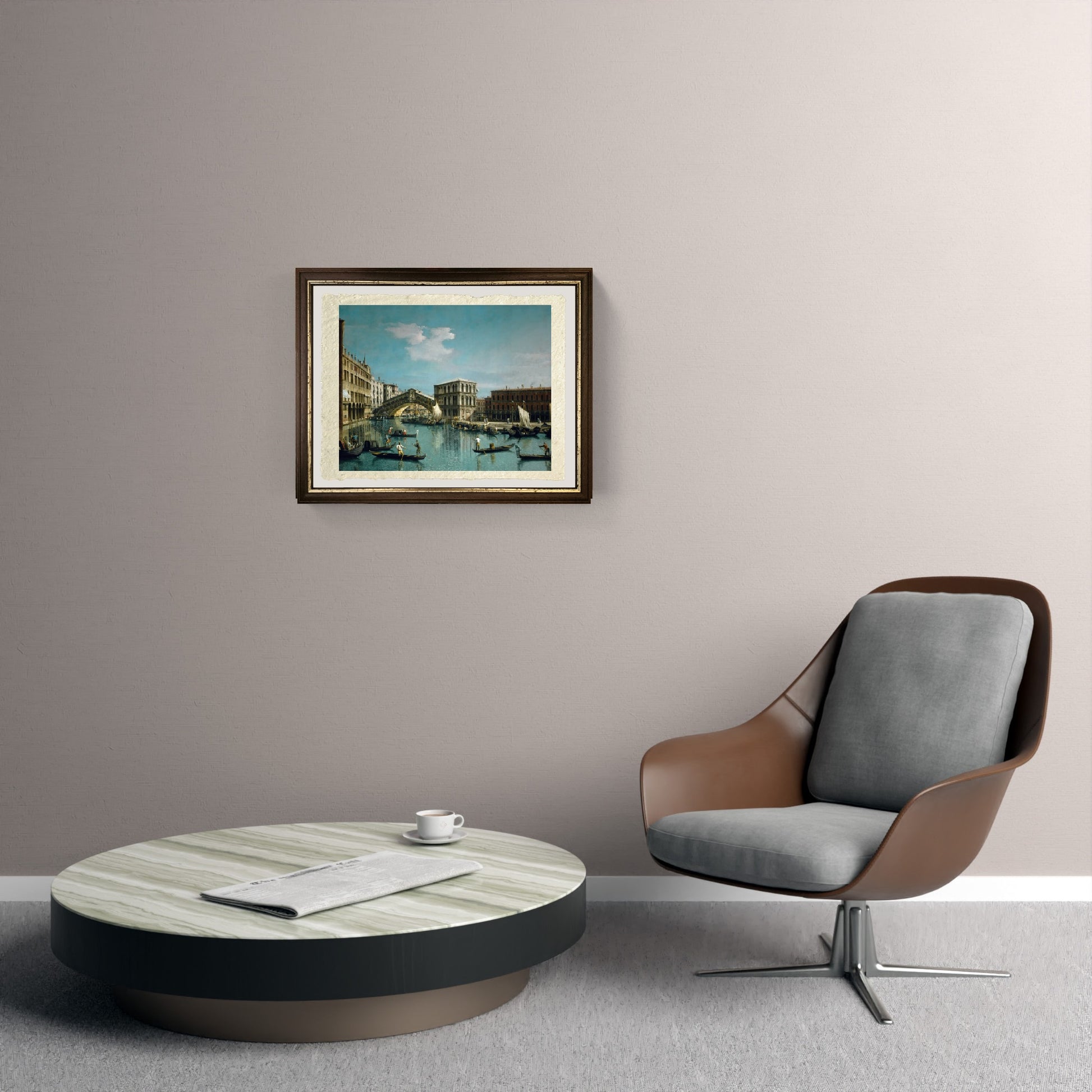 Originale e raro dipinto settecentesco del ponte di Rialto, realizzata da Giovanni Antonio Canal detto Canaletto. In primo piano troviamo il Canal Grande, trafficato da imbarcazioni, mentre attorno vi sono dei bei palazzi veneziani. L'acqua del canale è dipinta da Canaletto con sfumature verde azzurro assumendo un colore similare a quello del cielo. Più sullo sfondo ponte Rialto, al coperto, con i suoi negozi, rappresenta un punto di riferimento per i Veneziani. Il cielo è limpido, sfumato con azzurro chiaro e bianco per qualche nuvola.