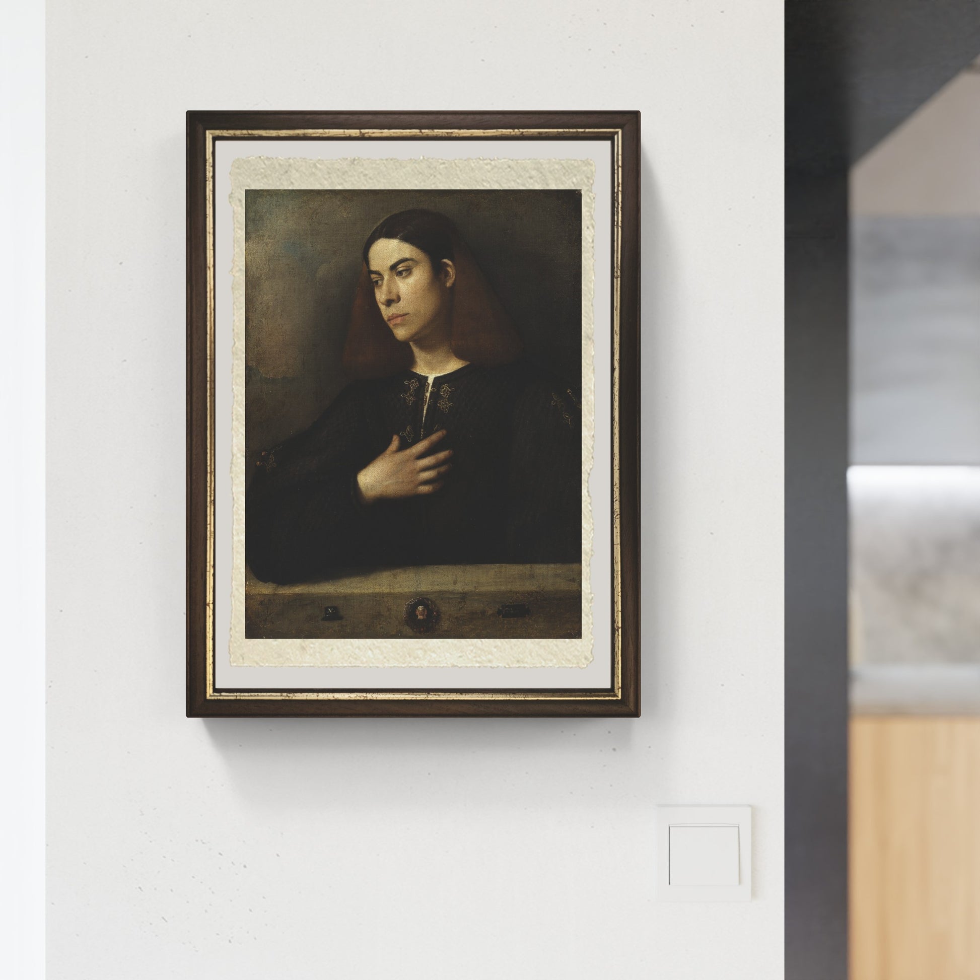 L’abbigliamento elegante ma sobrio, unito alla posa misurata, contribuisce a un’immagine di dignità e silenziosa armonia. La luce soffusa modella il volto con morbide transizioni chiaroscurali, mentre lo sfondo scuro isola la figura e ne accentua la presenza emotiva. Tipico di Giorgione è il senso di mistero che avvolge il ritratto, trasformando l’effigie in una meditazione poetica sull’animo umano.