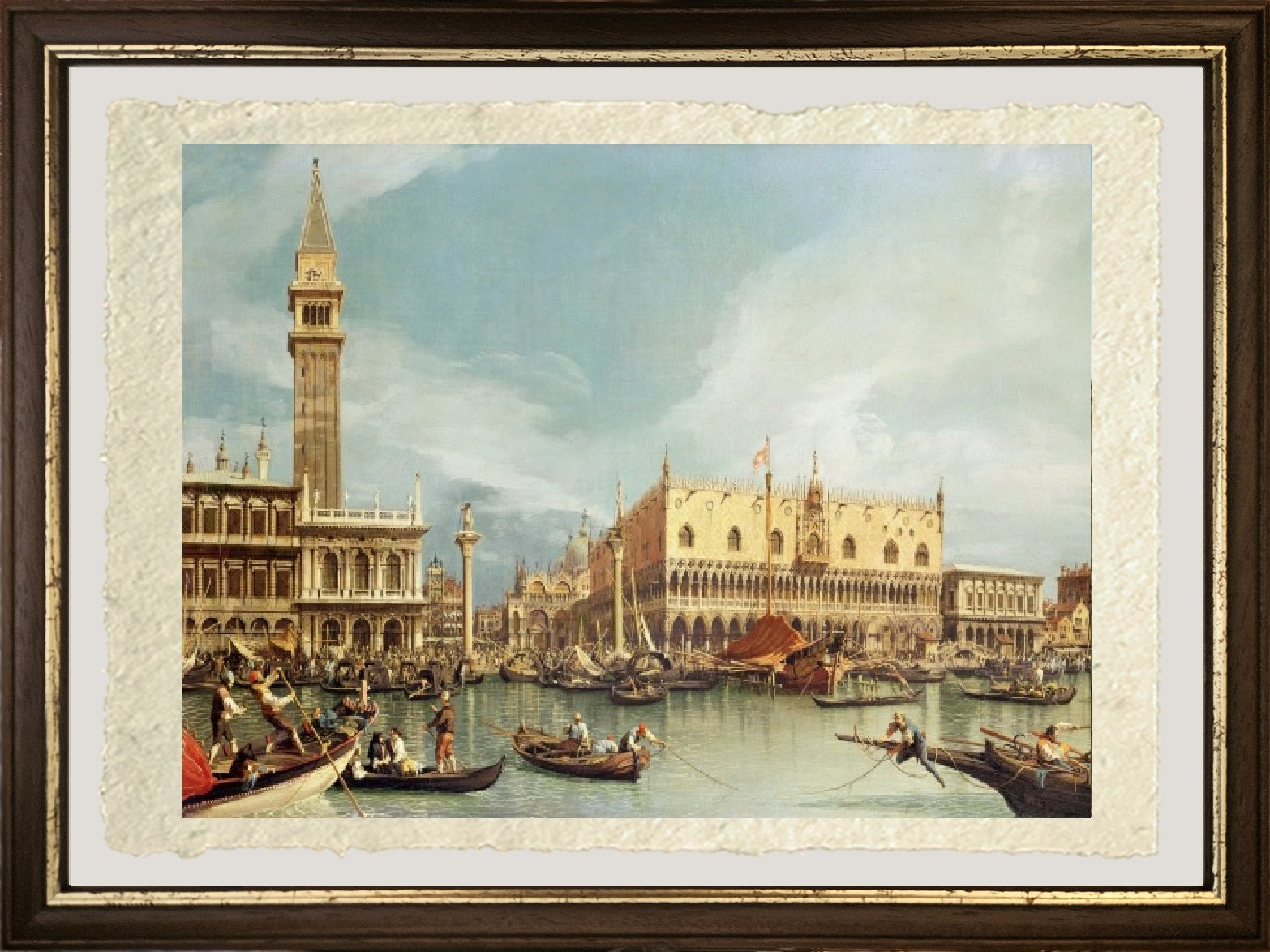 Originale e settecentesca veduta del molo di Venezia con dettaglio di approdo delle imbarcazioni, realizzata da Giovanni Antonio Canal detto Canaletto. La visione è dal Canal Grande, con le imbarcazioni ormeggiate ordinatamente, ed i marinai che stanno facendo operazioni portuali, mentre altre imbarcazioni stanno manovrando. Più sullo sfondo si può ammirare il Palazzo Ducale ed il Campanile di San Marco. Il cielo è sereno, con qualche nuvola bianca all'orizzonte. Il quadro, un olio su tela, non è datato. Esistono numerose varianti create dal Canaletto di questo dipinto.