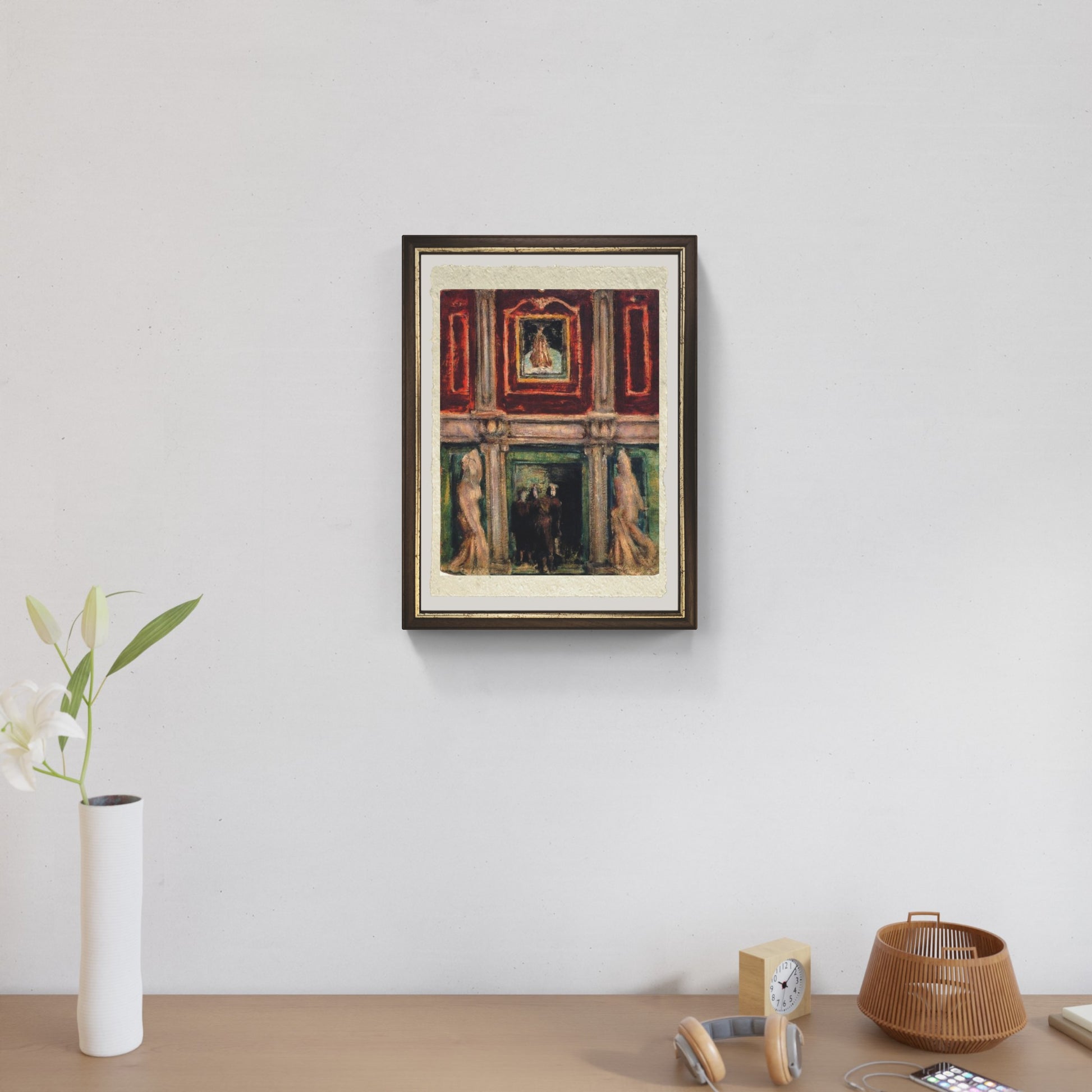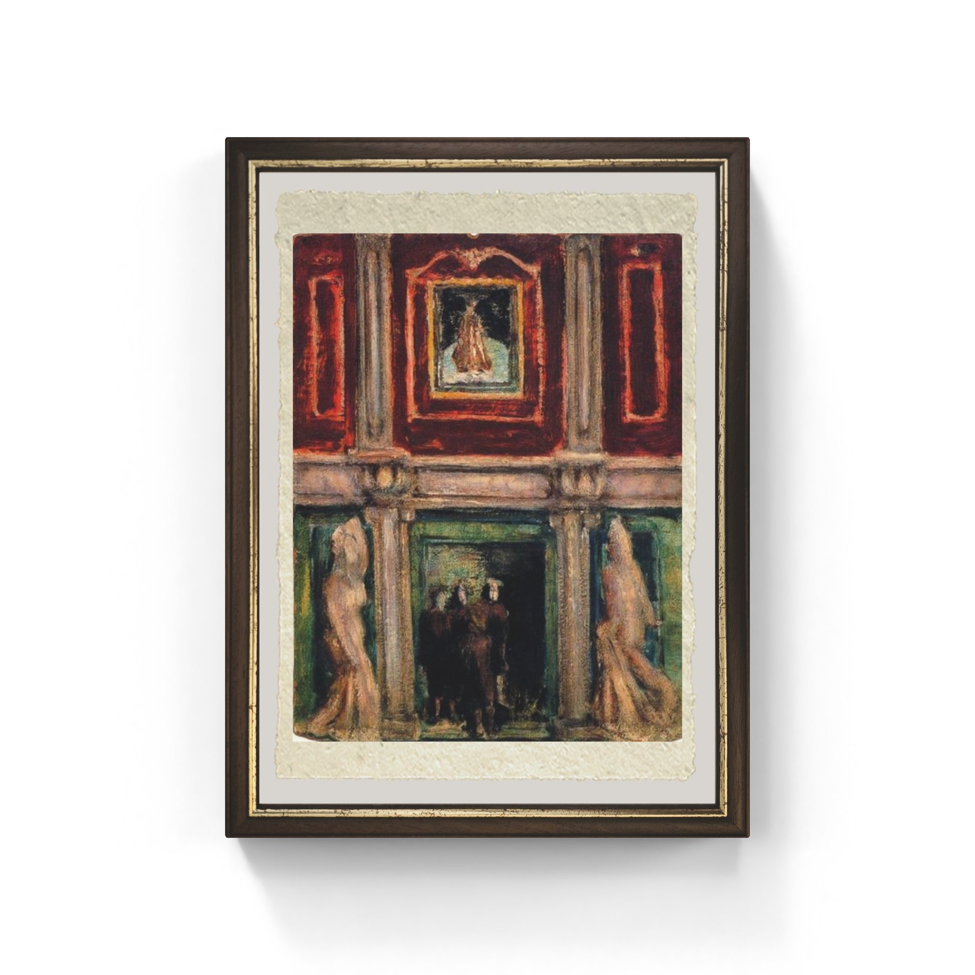 Nel dipinto, Rothko rappresenta un vasto e imponente spazio architettonico, ricco di colonne e dominato da intensi toni di rosso e verde. Al centro, sopra l'ingresso, si staglia una figura incorniciata, quasi a fungere da punto focale. Tre figure umane sono raffigurate in basso al centro, avvolte nell'ombra, e contrastano nettamente con la luminosità degli elementi architettonici circostanti. La stilizzazione delle colonne e delle pareti conferisce alla scena una sensazione di grandezza e di profonda storicità. Le figure sembrano quasi svanire di fronte alla maestosità della struttura, mettendo in evidenza il contrasto tra l'uomo e l'ambiente che lo circonda. Questo gioco di scale e luce contribuisce a creare un'atmosfera solenne e quasi teatrale. Interno cattura un istante di silenziosa contemplazione all'interno di un mondo quasi irreale, offrendo uno spunto che anticipa le future esplorazioni di Rothko nella profondità emotiva e simbolica, prima che il suo stile evolva verso l'astrazione pura.