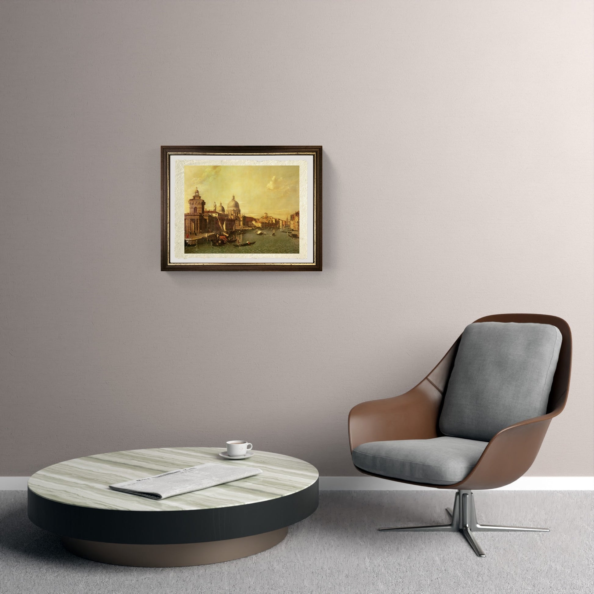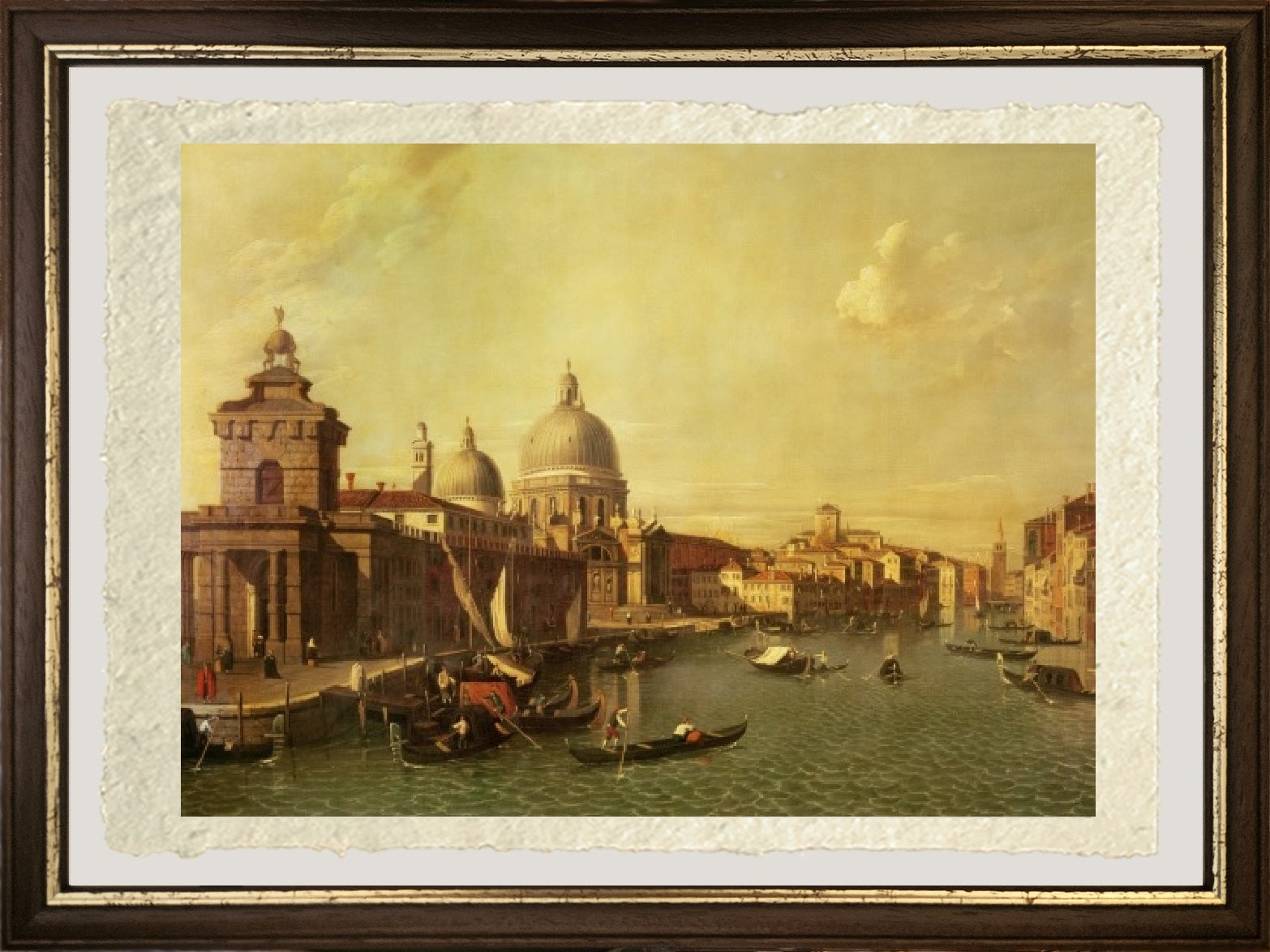 Originale e luminosa veduta della chiesa Santa Maria della Salute, con sfondo giallo oro, realizzata da Giovanni Antonio Canal detto Canaletto. La vista è dall'ingresso del Canal Grande solcato da imbarcazioni di varia grandezza. In primo piano la banchina del molo, con scene di vita quotidiana. Più sullo sfondo ecco punta della Dogana, con vicino la splendida chiesa di Santa Maria della Salute. Il cielo è sereno con qualche nuvola bianca all'orizzonte. Il dipinto, un olio su tela, non è datata. Esistono altre varianti di quest'opera.