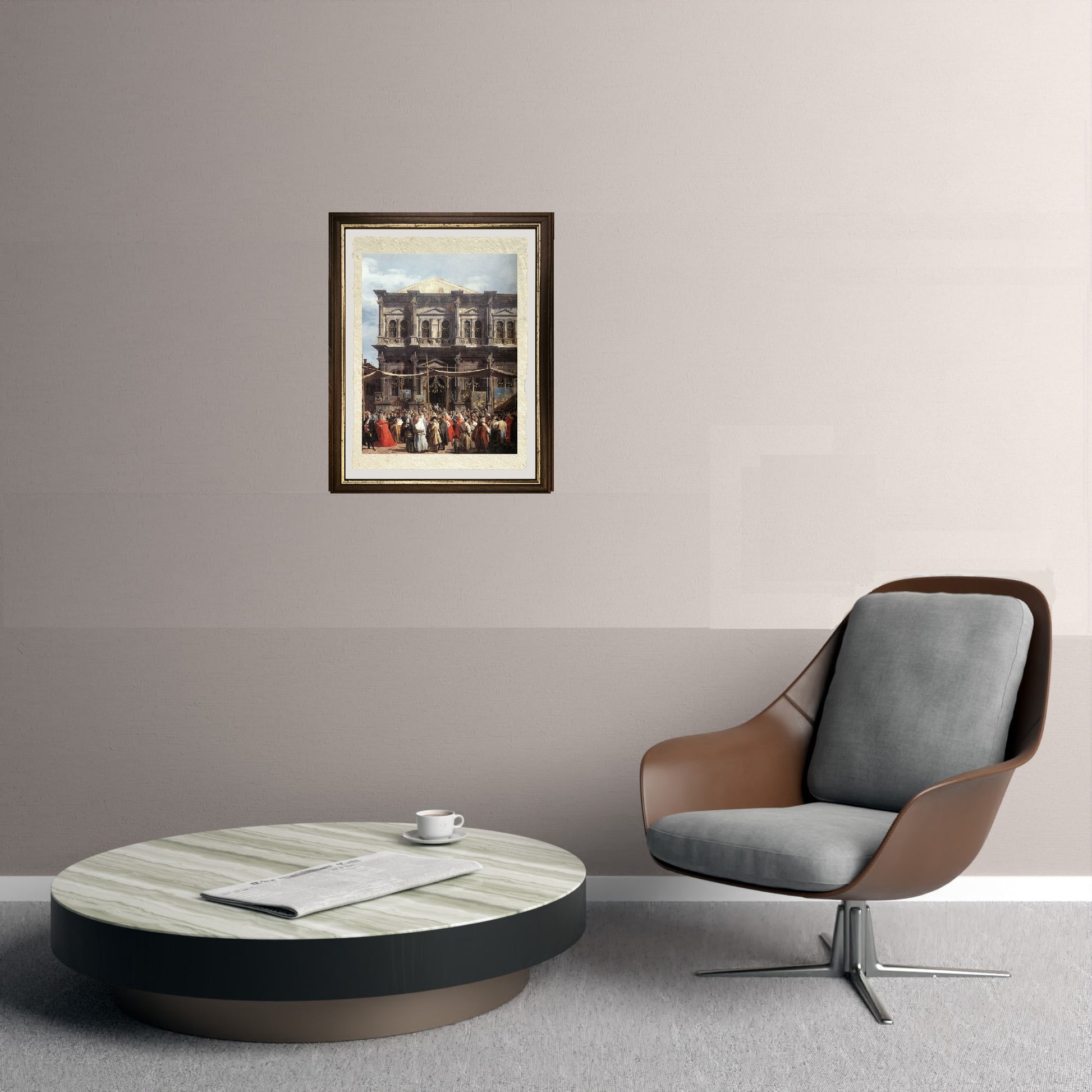 Originale e rara settecentesca veduta della festa di San Rocco a Venezia, realizzata da Giovanni Antonio Canal detto Canaletto. In primo piano i nobili veneziani, vestiti con i loro abiti colorati e di pregio. Più sullo sfondo il palazzo veneziano, dipinto dal Canaletto con particolari architettonici. Il cielo è sereno, con qualche nuvola bianca all'orizzonte. Il quadro, un olio su tela, è datato 1735. Esistono alcune varianti create dal Canaletto di questo dipinto.