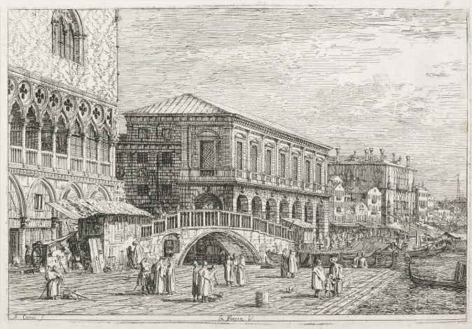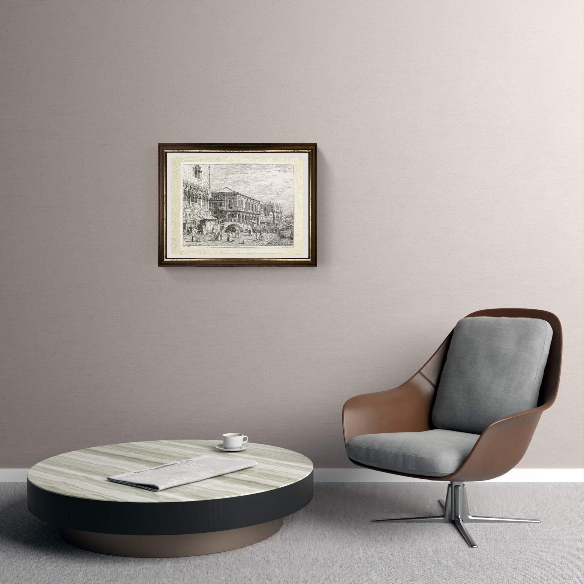 Originale e rara incisione della prigione a Venezia, collegata al palazzo Ducale con il ponte degli sospiri, realizzata da Giovanni Antonio Canal detto il Canaletto. In primo piano la piazzetta San Marco, con a sinistra un dettaglio di palazzo Ducale. Attiguo al palazzo ecco dipinta la prigione di Venezia dal Canaletto, un grande palazzo a pianta rettangolare, avente di fronte la riva degli schiavoni. Il cielo è sereno con qualche nuvola all'orizzonte. L'incisione è datata tra il 1735 ed il 1746. Esistono altre varianti di questa opera.