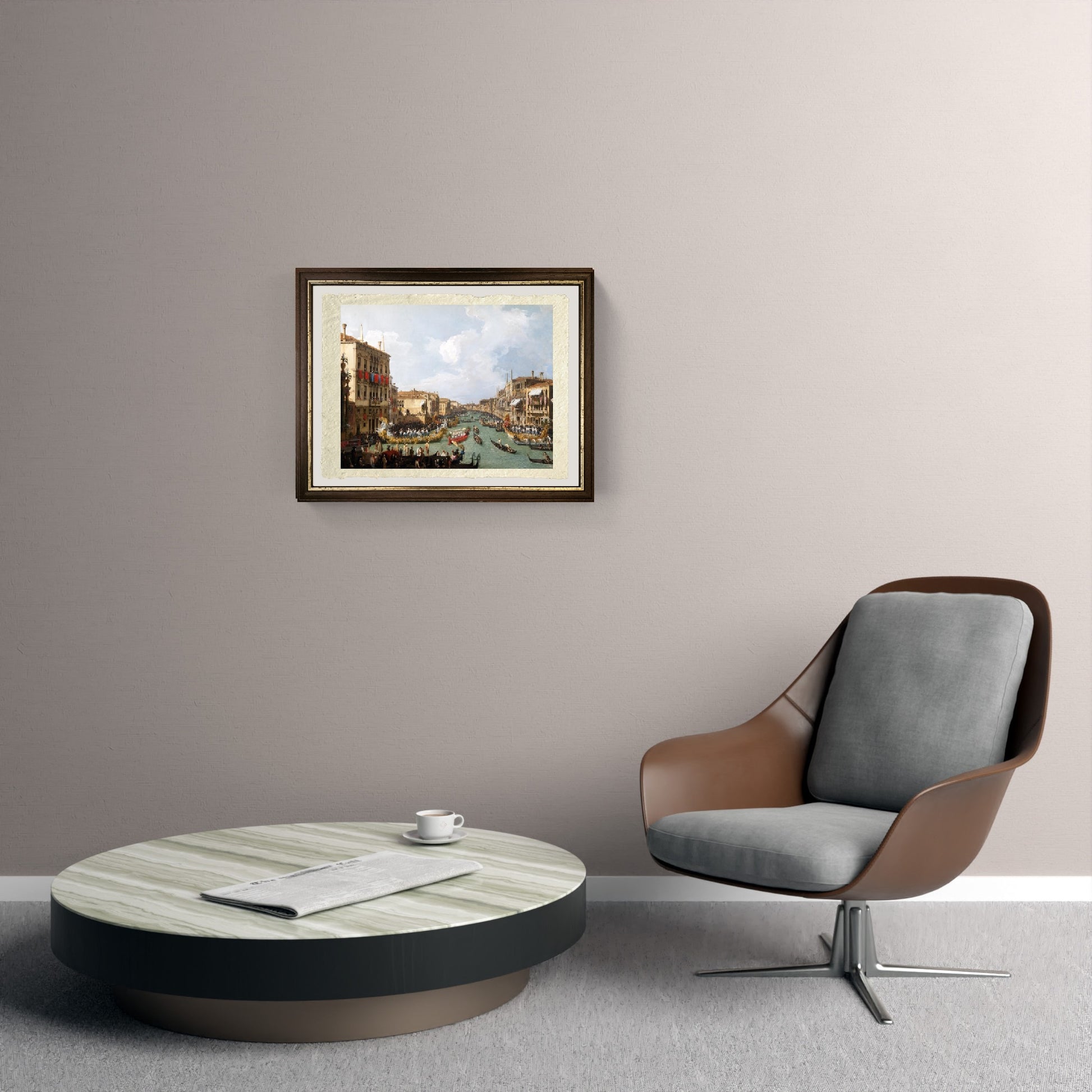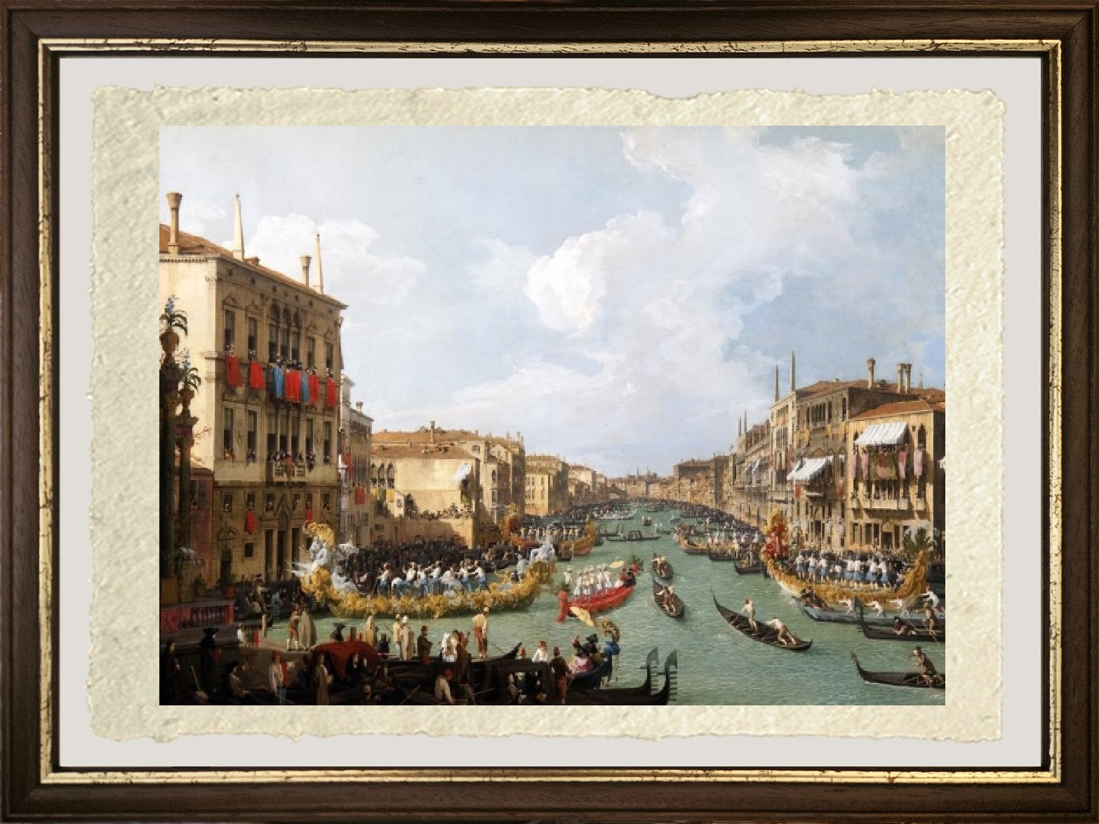 Originale e luminosa settecentesca veduta del Canal Grande con in corso una regata, realizzata da Giovanni Antonio Canal. Siamo nel giorno del redentore, tutta Venezia è in festa, ed il Canal Grande è pieno d'imbarcazioni colorate. Il cielo è sereno, in primo piano al centro del Canal Grande, un gondolino rosso. Dal lato sinistro del dipinto si può ammirare un palazzo con dei drappi rossi appesi alla balconata. Il cielo è sereno, la giornata è ideale per la festa. Il quadro, un olio su tela, è datato 1731. Esistono numerose varianti dipinte dal Canal di questo quadro.