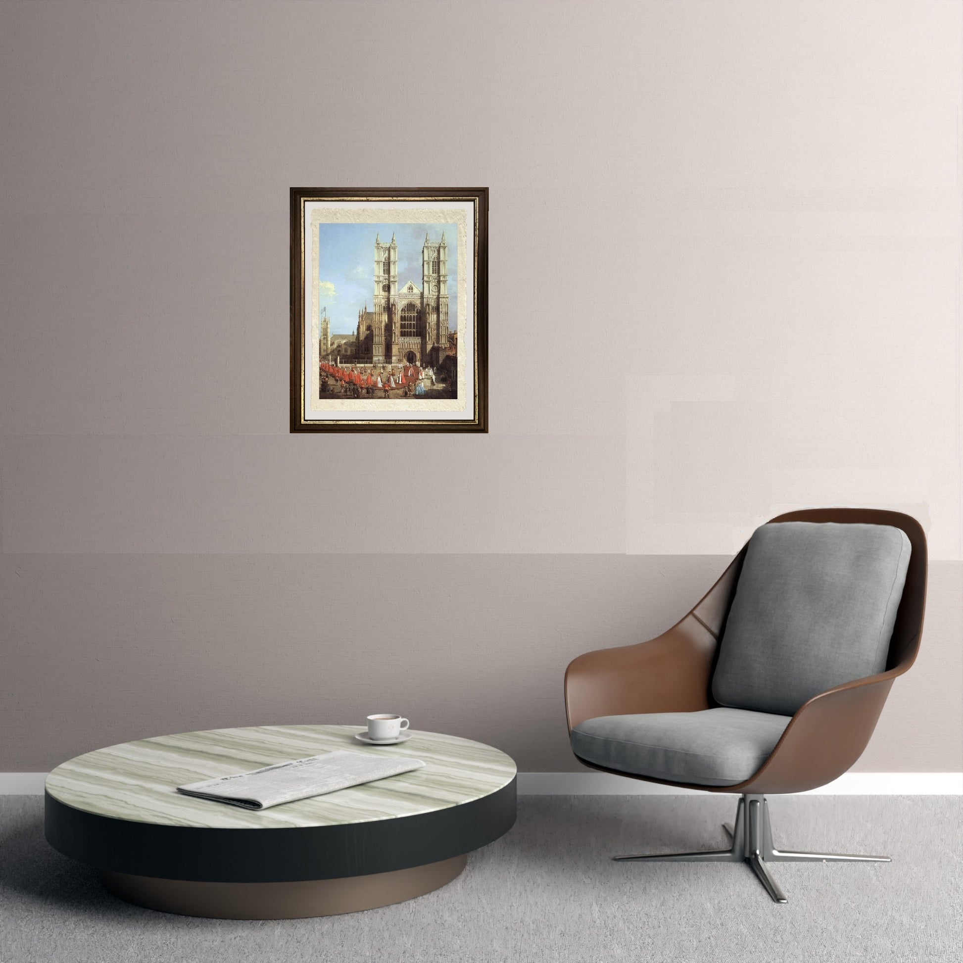 Originale e rara veduta settecentesca della processione dei Cavalieri del Bagno, realizzata da Giovanni Antonio Canal detto Canaletto. In primo piano possiamo osservare la piazzetta antistante la grande chiesa in stile gotico, con un tappeto steso, ed i cavalieri vestiti con mantello rosso chiaro, che stanno camminando in processione. Ad assistere l'inusuale parata ci sono alcuni cittadini. I cavalieri sono tantissimi ed il corteo che creano è molto lungo. Il cielo è sereno con qualche nuvola rosa all'orizzonte.