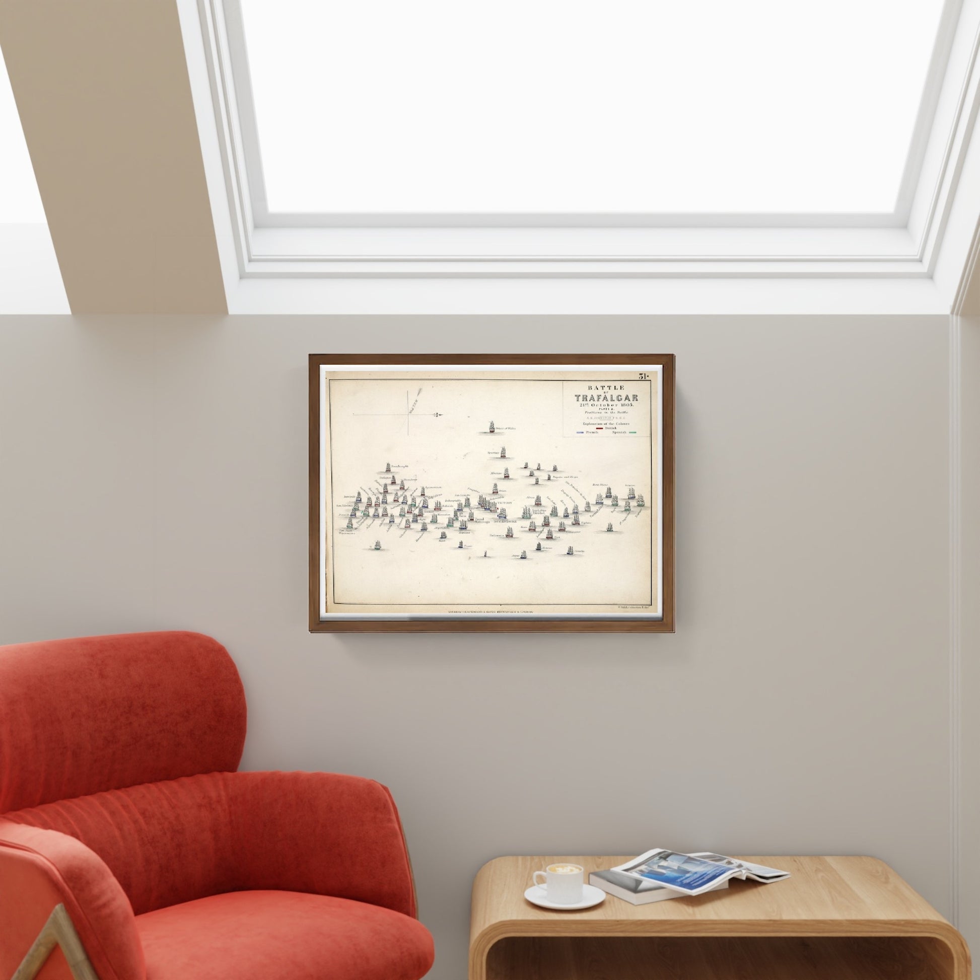 Mappa storica della Battaglia di Trafalgar creata da Alexander Keith Johnston. Si tratta di un'incisione colorata a mano. La mappa è stata pubblicata da William Blackwood and Sons, Edimburgo e Londra, nel 1848.