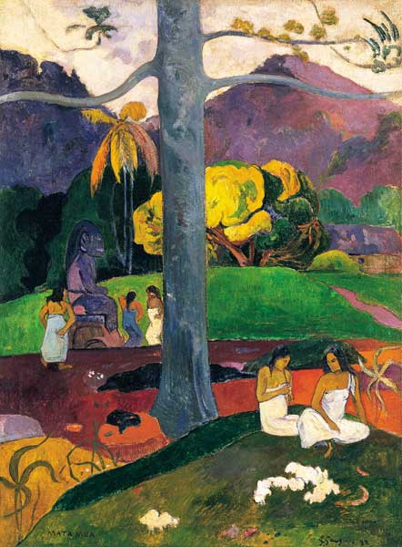Sullo sfondo, una divinità scolpita e un albero fiorito rinforzano il carattere sacro e atemporale dell’immagine. Gauguin utilizza tinte piatte, contorni marcati e composizioni simboliche per suggerire un mondo perduto, incontaminato e ricco di significati nascosti. Mata Mua non è solo una rappresentazione etnografica, ma un inno nostalgico a un’umanità primitiva e armoniosa che l’artista percepiva come minacciata dal progresso occidentale.
