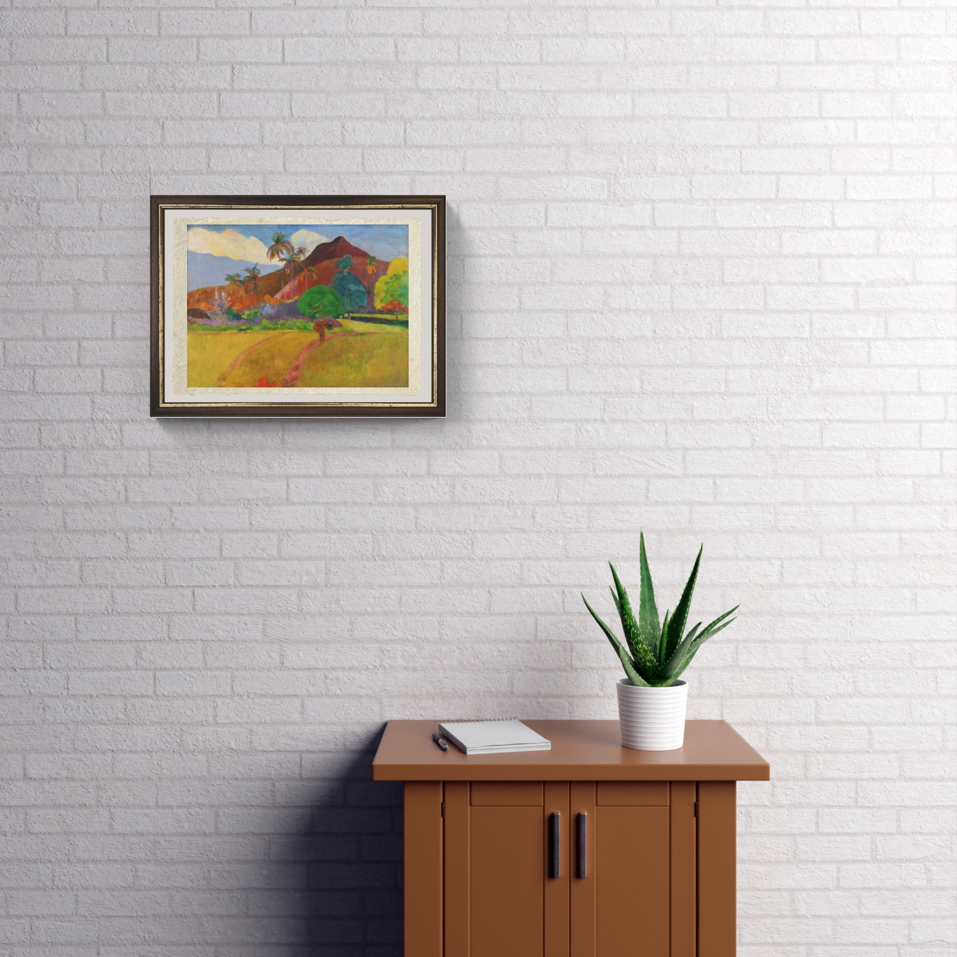 Tahitian Mountains è un’opera che riflette il profondo legame di Paul Gauguin con il paesaggio polinesiano, vissuto come luogo di rigenerazione spirituale e ritorno a una natura primordiale. Il dipinto presenta una catena montuosa dai profili morbidi e massicci, resa con colori intensi e non naturalistici, tipici del linguaggio post-impressionista dell’artista. Le montagne emergono come presenze quasi misteriose, fuse con la vegetazione rigogliosa e l’atmosfera luminosa dell’isola. In primo piano compaiono spesso figure femminili tahitiane, tranquille e meditate, oppure semplici elementi del paesaggio che contribuiscono a creare un senso di equilibrio e calma interiore.