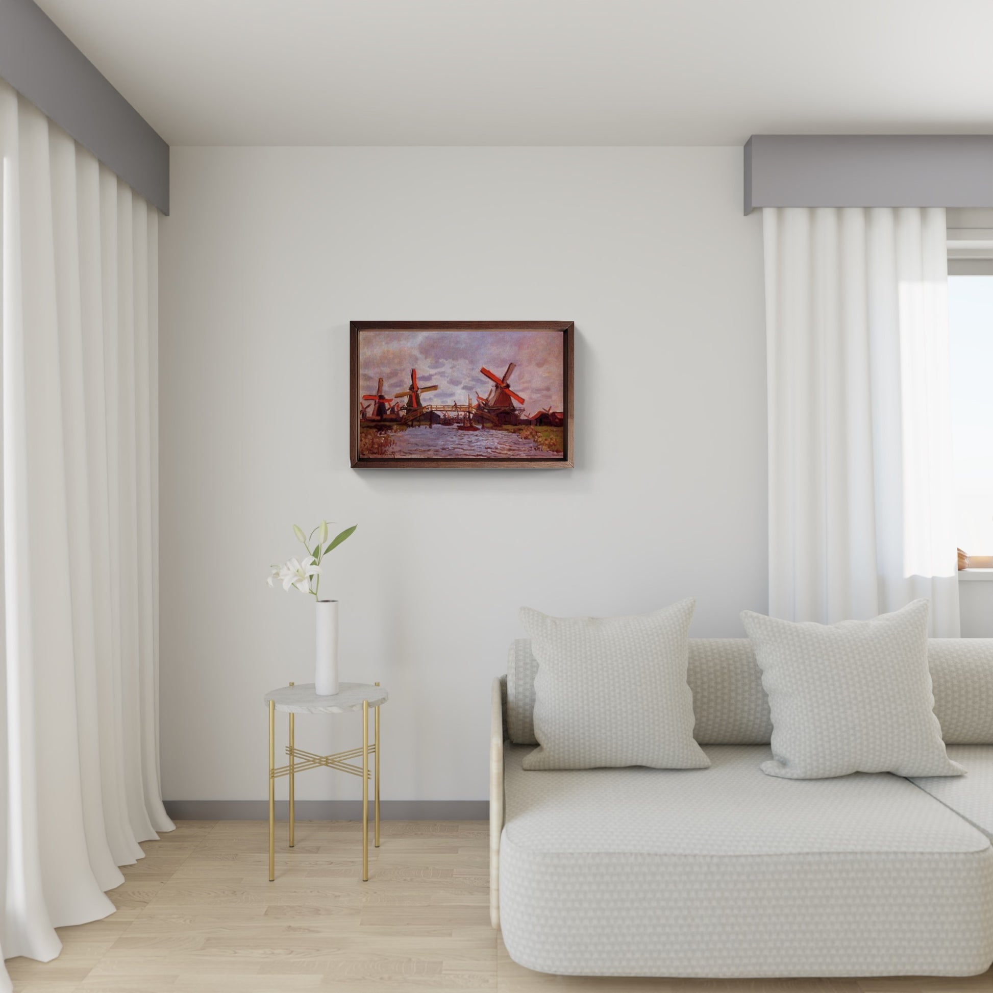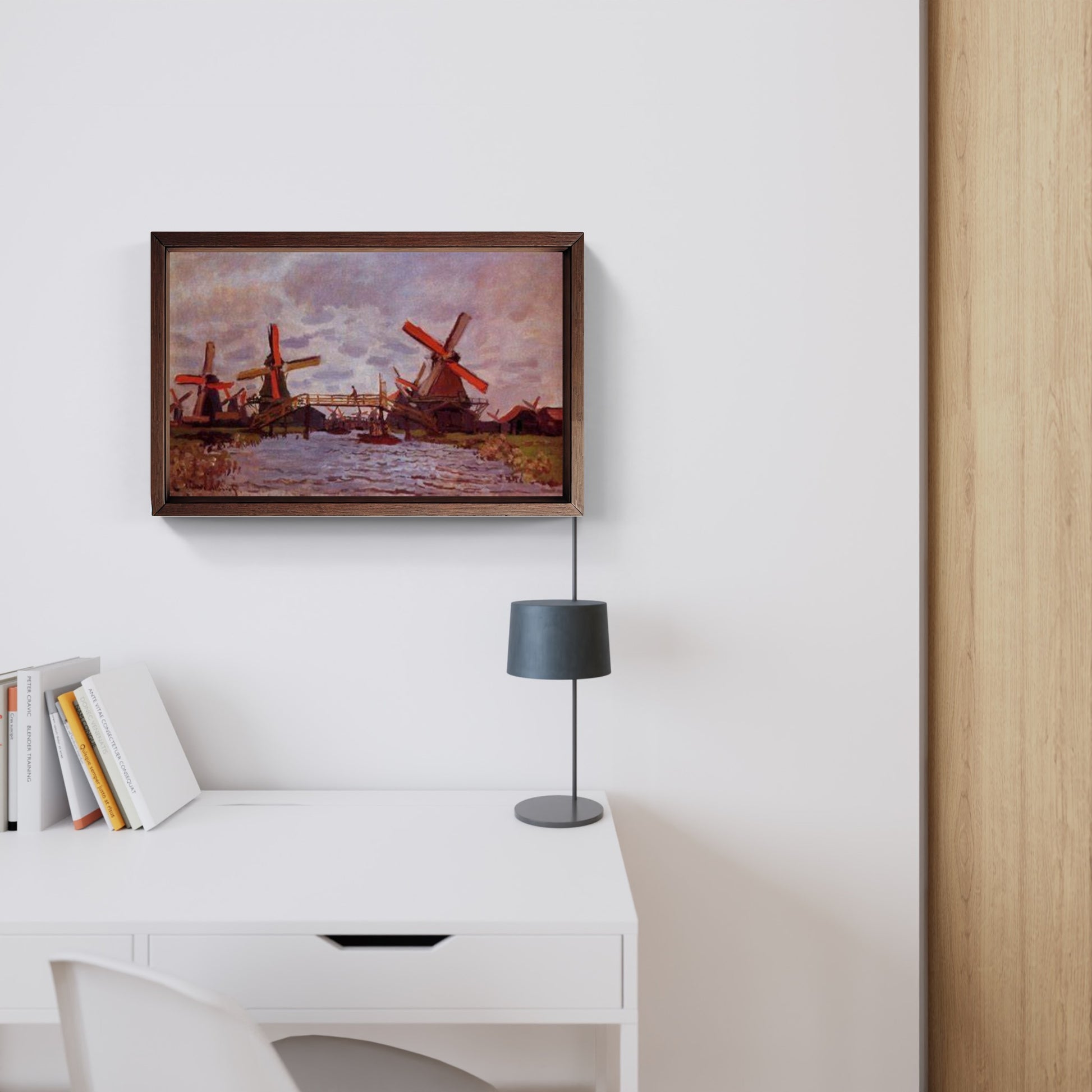 Il dipinto "Mulini a vento vicino a Zaandam" di Claude Monet, realizzato nel 1871, offre uno sguardo sereno e illuminante sulla campagna olandese del XIX secolo. In quest'opera, Monet cattura un paesaggio caratterizzato dai tradizionali mulini a vento, elementi distintivi dell'architettura e dell'ingegneria dei Paesi Bassi.