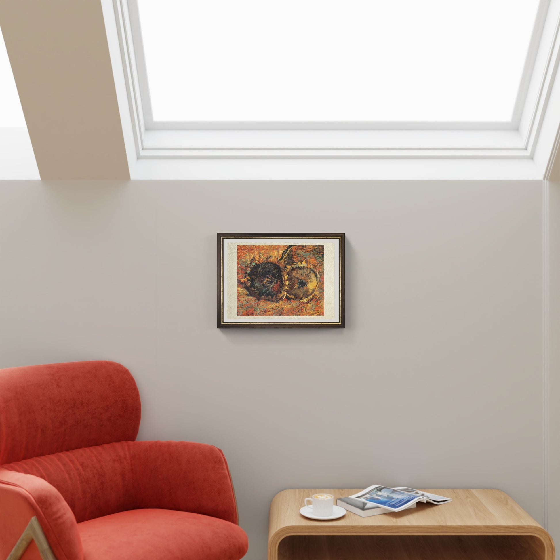 Natura morta con due girasoli di Vincent van Gogh è un’opera che racchiude tutta la forza espressiva e simbolica del celebre pittore olandese. Il quadro raffigura due girasoli, colti nel pieno della loro vitalità, immersi in una luce calda e avvolgente. Le pennellate dense e dinamiche, tipiche dello stile di Van Gogh, donano ai fiori un movimento vibrante, come se fossero attraversati da un’energia interiore. I toni gialli e ocra dominano la composizione, esaltando il contrasto con lo sfondo più tenue e creando un effetto di luminosità intensa.