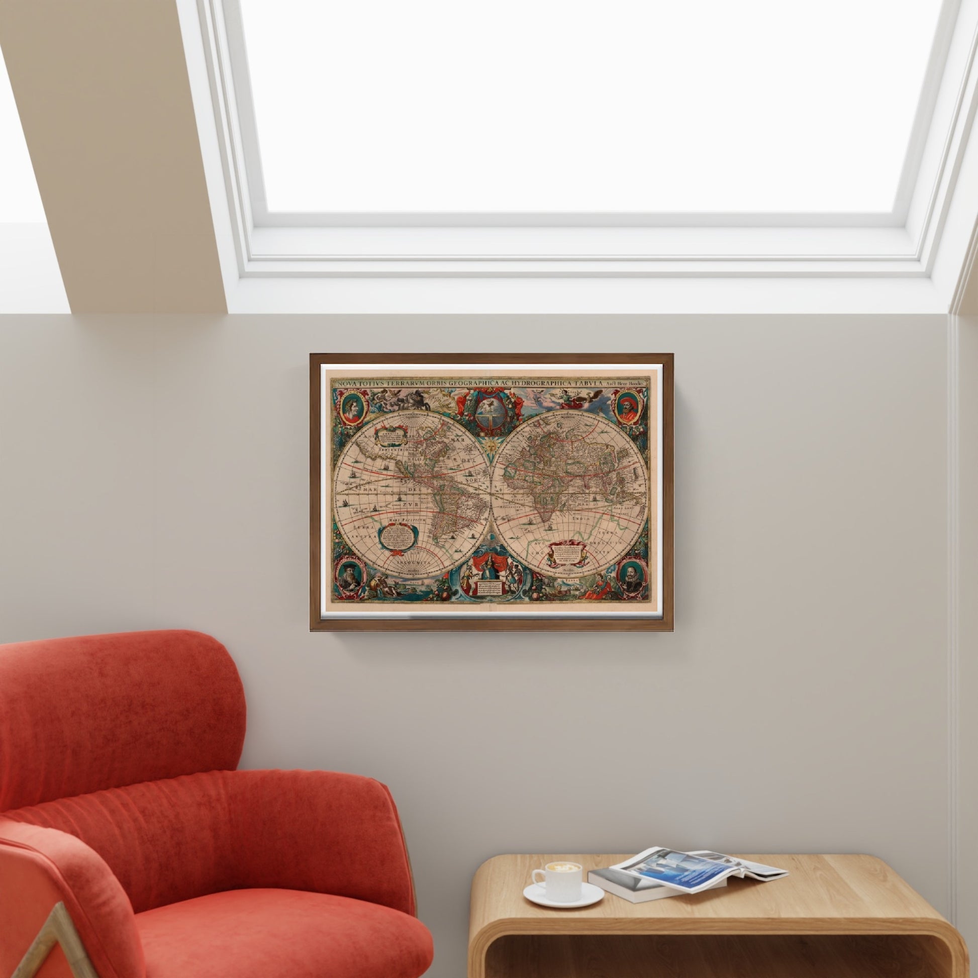 Al difuori degli emisferi vi sono raffigurate delle allegorie prese dalla mitologia e dal mondo classico. Mentre ai quattro lati sono presenti i ritratti di personaggi illustri.