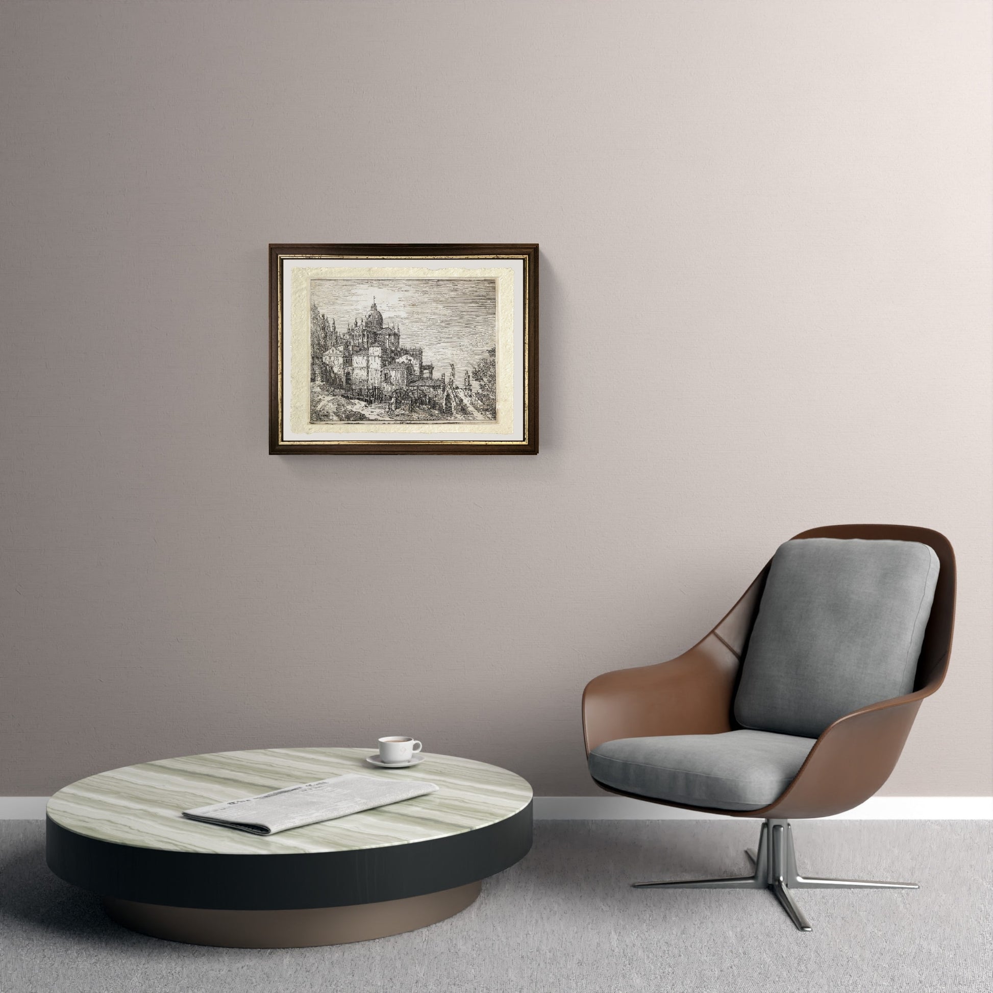 Originale incisione con acquaforte su carta di una chiesa, con case e mulino, realizzata da Giovanni Antonio Canal detto Canaletto. In primo piano troviamo la chiesa, arroccata su una collinetta, mentre più a valle si possono notare delle case, ed in particolare un mulino che sfrutta l'acqua di un ruscello. In evidenza sul lato destro c'è una strada, con un ponte che conduce al mulino e più in su alla chiesa. A metà del ponte sorge un capitello per la devozione.