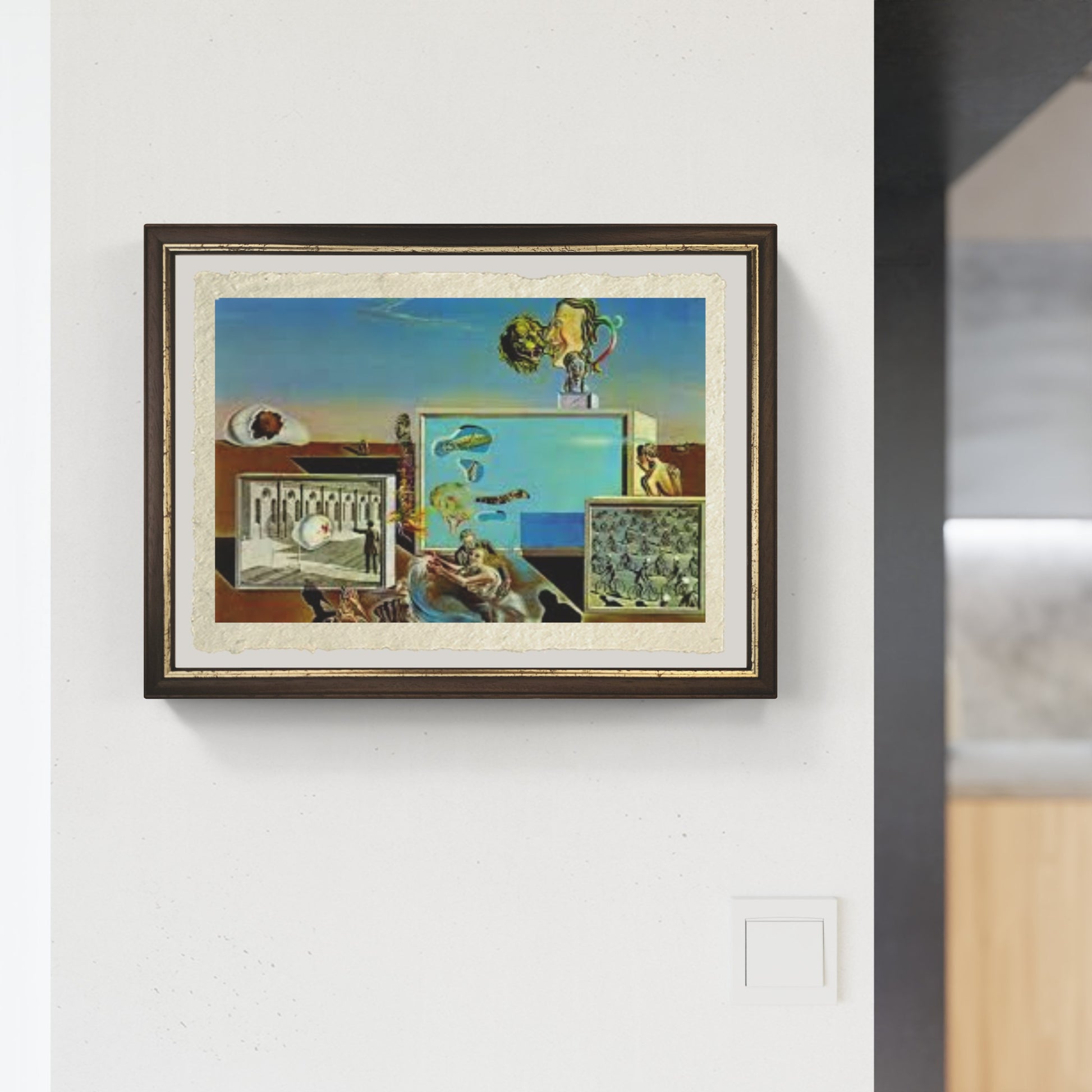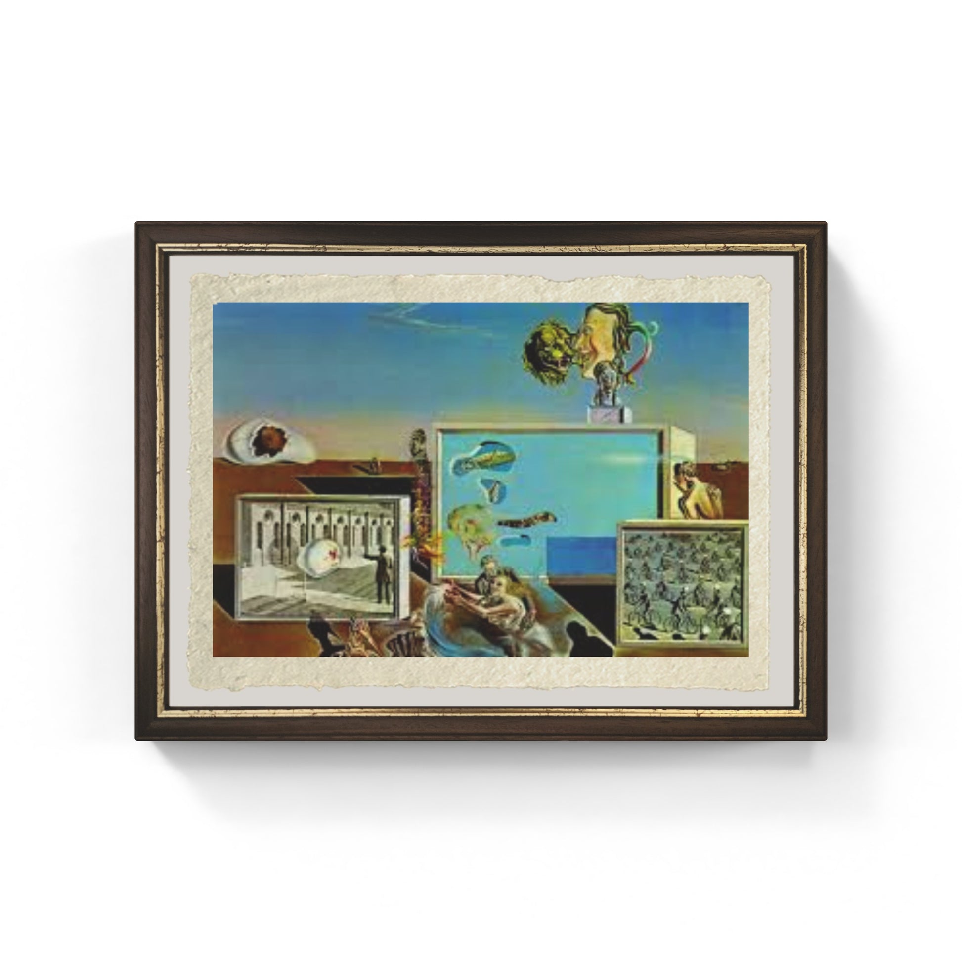 Il titolo giocoso allude al desiderio e al piacere, ma l’atmosfera resta intrisa di inquietudine. La luce intensa scolpisce le forme, rendendo l’irreale quasi tangibile. Gli elementi si trasformano davanti allo sguardo: ciò che sembra un volto può diventare un oggetto, una figura può dissolversi nel paesaggio. L’opera riflette l’interesse di Dalí per la psicologia del desiderio e per l’illusione visiva, evocando un mondo dove pulsioni e fantasie diventano architetture del subconscio.