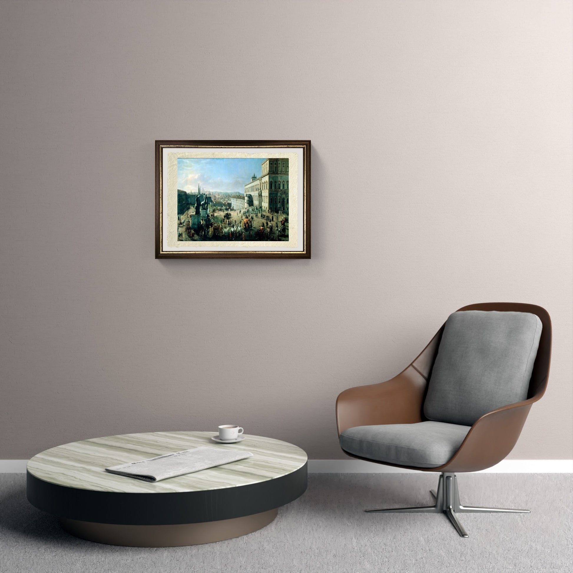 Veduta settecentesca del Palazzo sito in Monte Cavallo dipinta da Gaspare Vanvitelli. La piazza è gremita di popolazione intenta nelle loro attività. Sulla sinistra c'è una statua equestre, una fontana attorniata da passanti in carrozza ed anche venditori di cavalli bianchi. Il dipinto è illuminato dal sole al mattino. Un cielo limpido ed azzurro con sfumature di bianco, evidenzia una bella giornata. La tela è una delle tante senza data del van Wittel. Questo dipinto vede aree di buio o scure che contrastano con il chiarore del cielo. Anche questo quadro fa parte delle prolissa produzione che il Vanvitelli creò durante i suoi soggiorni romani. Il dipinto si può ammirare al Palazzo Corsini, Gallerie Nazionali Barberini Corsini, Roma.
