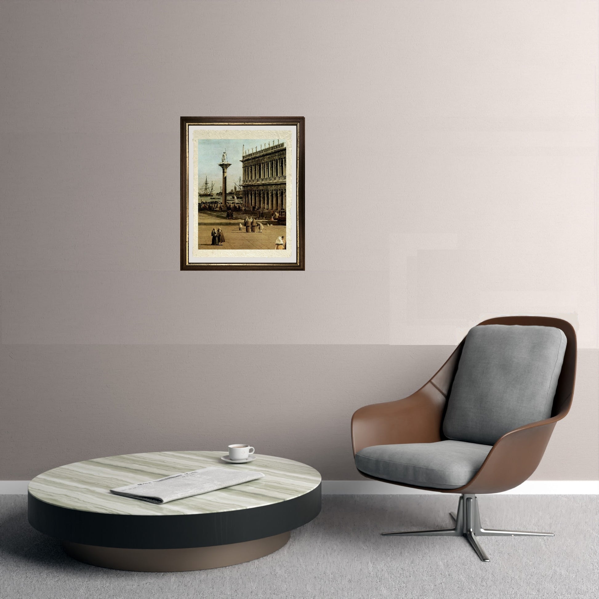 Originale luminosa veduta della piazzetta di San Marco con particolare colonna San Todaro, realizzata da Giovanni Antonio Canal detto Canaletto. In primo piano troviamo la piazzetta con la banchina del molo, e scene di vita quotidiana, le barche ancorate e altre che manovrano sul Canal Grande. A centro dipinto possiamo osservare la colonna di San Todaro, simbolo di Venezia, e a fianco un maestoso palazzo veneziano.