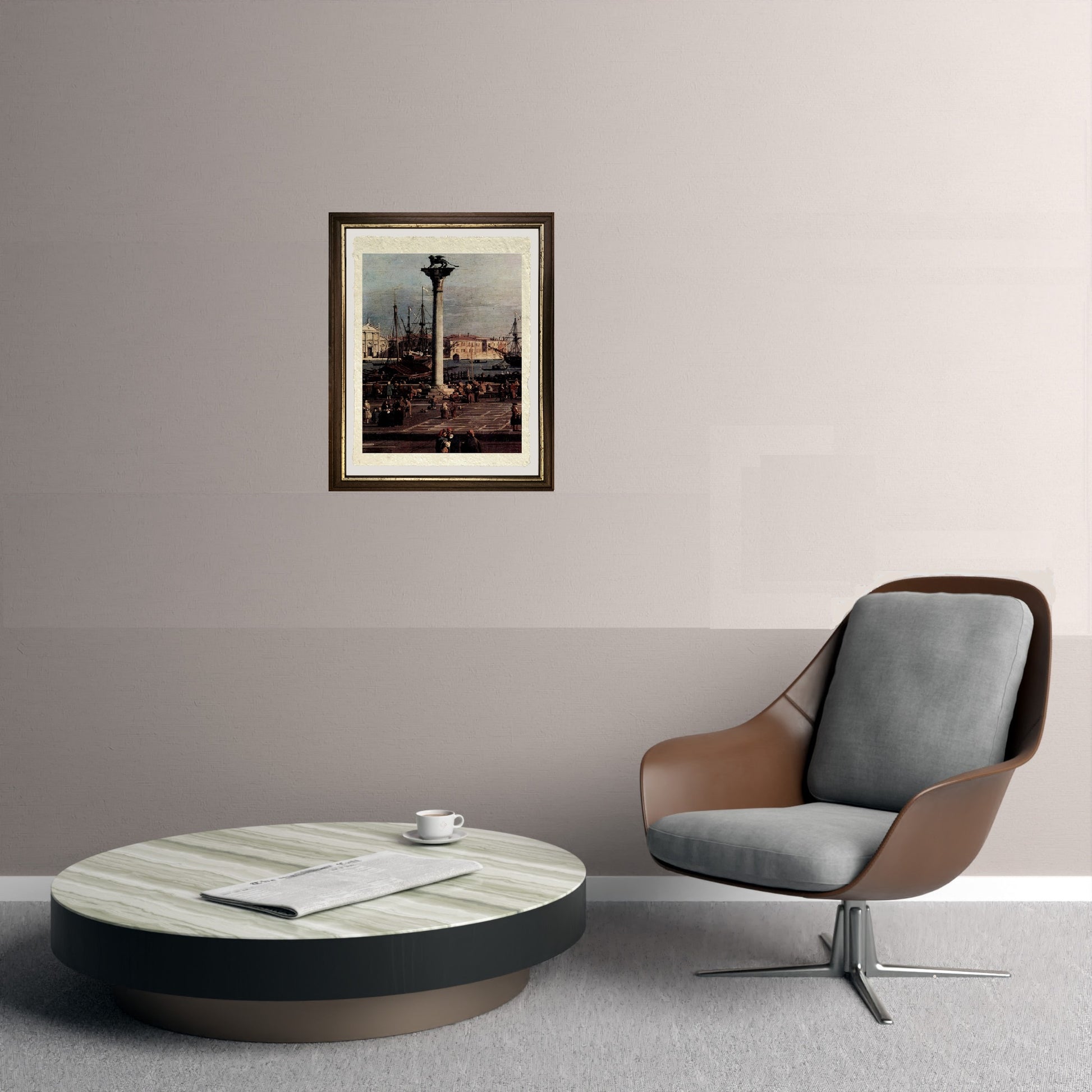 Originale e luminosa veduta della piazzetta di San Marco con particolare della colonna di San Marco, realizzata da Giovanni Antonio Canal detto Canaletto. In primo piano troviamo la colonna di San Marco, vista frontalmente, che si affaccia sulla piazzetta. Ai piedi del molo vi sono scene di vita quotidiana, ed alcune imbarcazioni tra le quali anche due velieri. Più sullo sfondo ci sono i palazzi dell'isola di San Giorgio Maggiore. Il cielo è sereno ma con qualche nuvola scura.