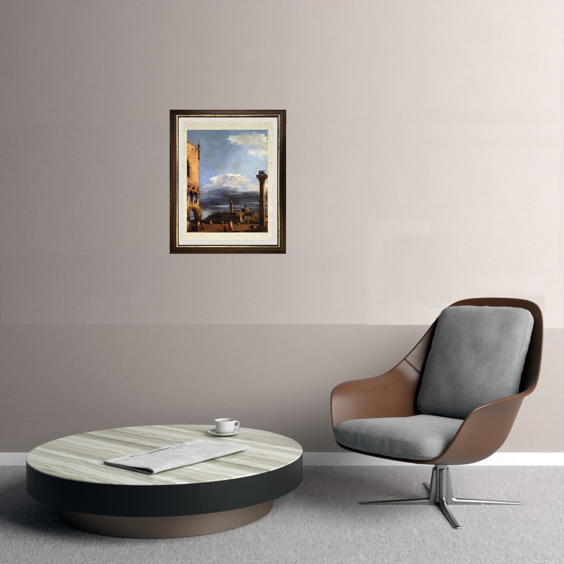 Originale luminosa veduta della piazzetta con particolare della colonna di San Marco, realizzata da Giovanni Antonio Canal detto Canaletto. In primo piano troviamo la piazzetta con la banchina del molo, e scene di vita quotidiana. Al centro del dipinto si intravede, in lontananza, l'isola di San Giorgio, mentre il lato sinistro ritrae un dettaglio del palazzo Ducale. Il cielo è sereno con qualche nuvola bianca in primo piano, mentre vi sono delle nuvole scure all'orizzonte.