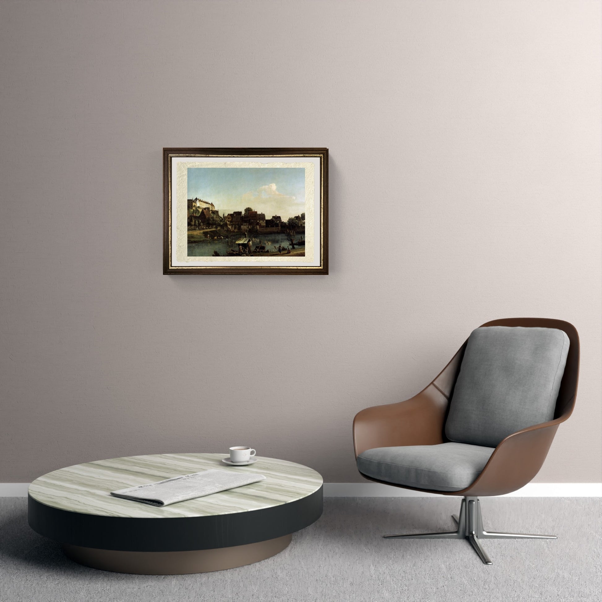 Luminosa ed originale veduta della cittadina di Pirna e del castello di Sonnenstein, realizzata da Bernardo Bellotto. In evidenza sul lato sinistro, su una collinetta e ben illuminato, troviamo il castello, mentre la cittadina portuale di Pirna è più a valle con le sue case sulle rive dell'Elba e i suoi abitanti.