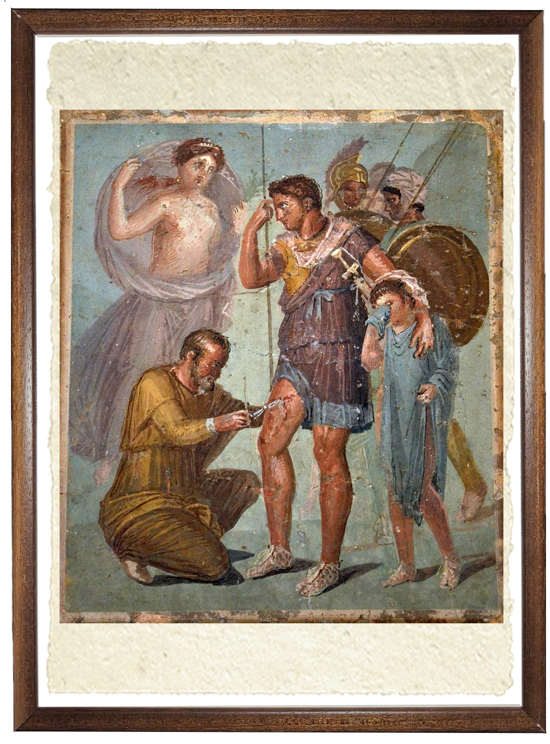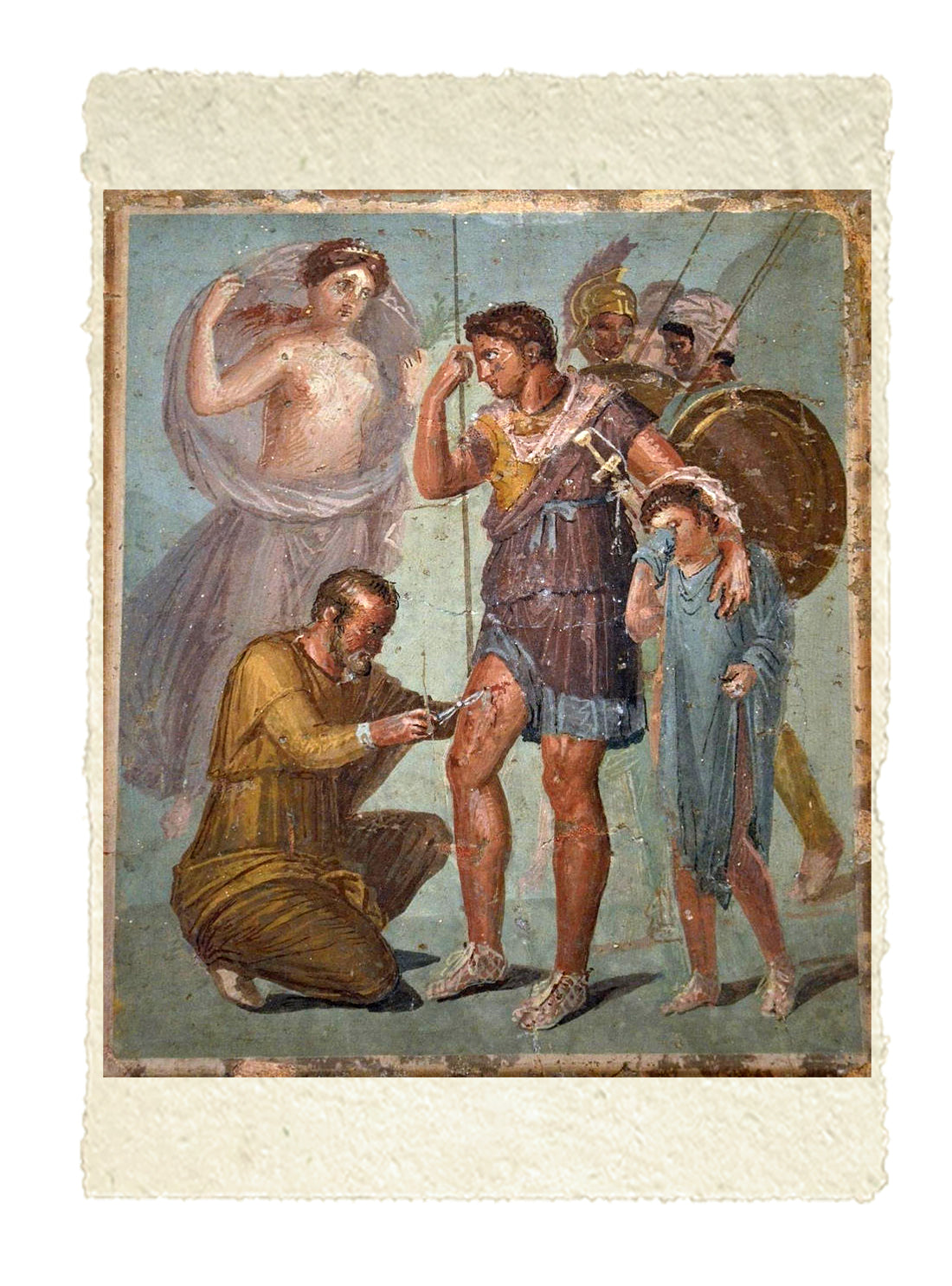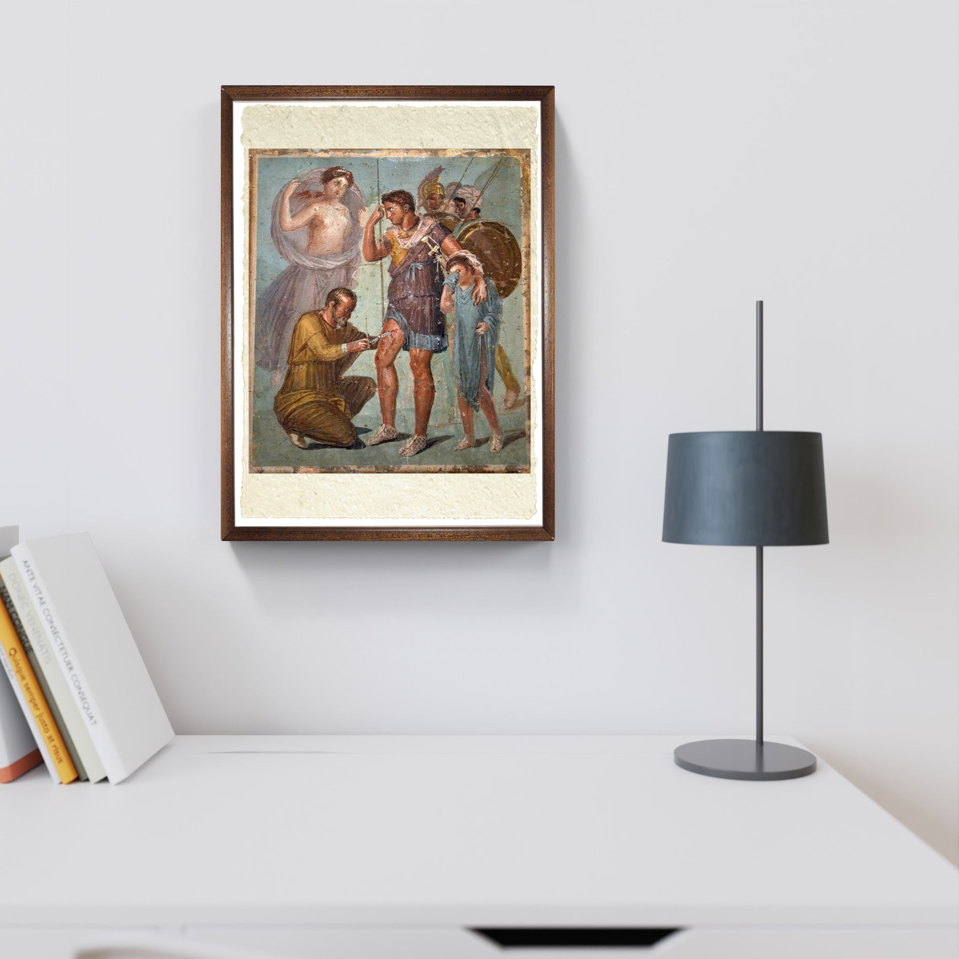 L'affresco "Enea ferito" è un'opera d'arte romana del I secolo d.C., rinvenuta nella Casa di Sirico a Pompei e attualmente conservata al Museo Archeologico Nazionale di Napoli. L'opera raffigura una scena tratta dal XII libro dell'Eneide di Virgilio: Enea, ferito alla coscia durante la battaglia contro i Rutuli, viene curato dal medico Iapige. Nell'affresco, Enea è in piedi mentre Iapige, inginocchiato, estrae la freccia dalla sua gamba. A sinistra, la dea Venere, madre di Enea, osserva la scena con preoccupazione, mentre il giovane Ascanio, figlio di Enea, si trova accanto al padre. Sul lato destro, due guerrieri armati assistono alla scena. Questo affresco testimonia la diffusione del mito virgiliano nell'antica Pompei e offre uno spaccato sulla conoscenza delle pratiche mediche dell'epoca.