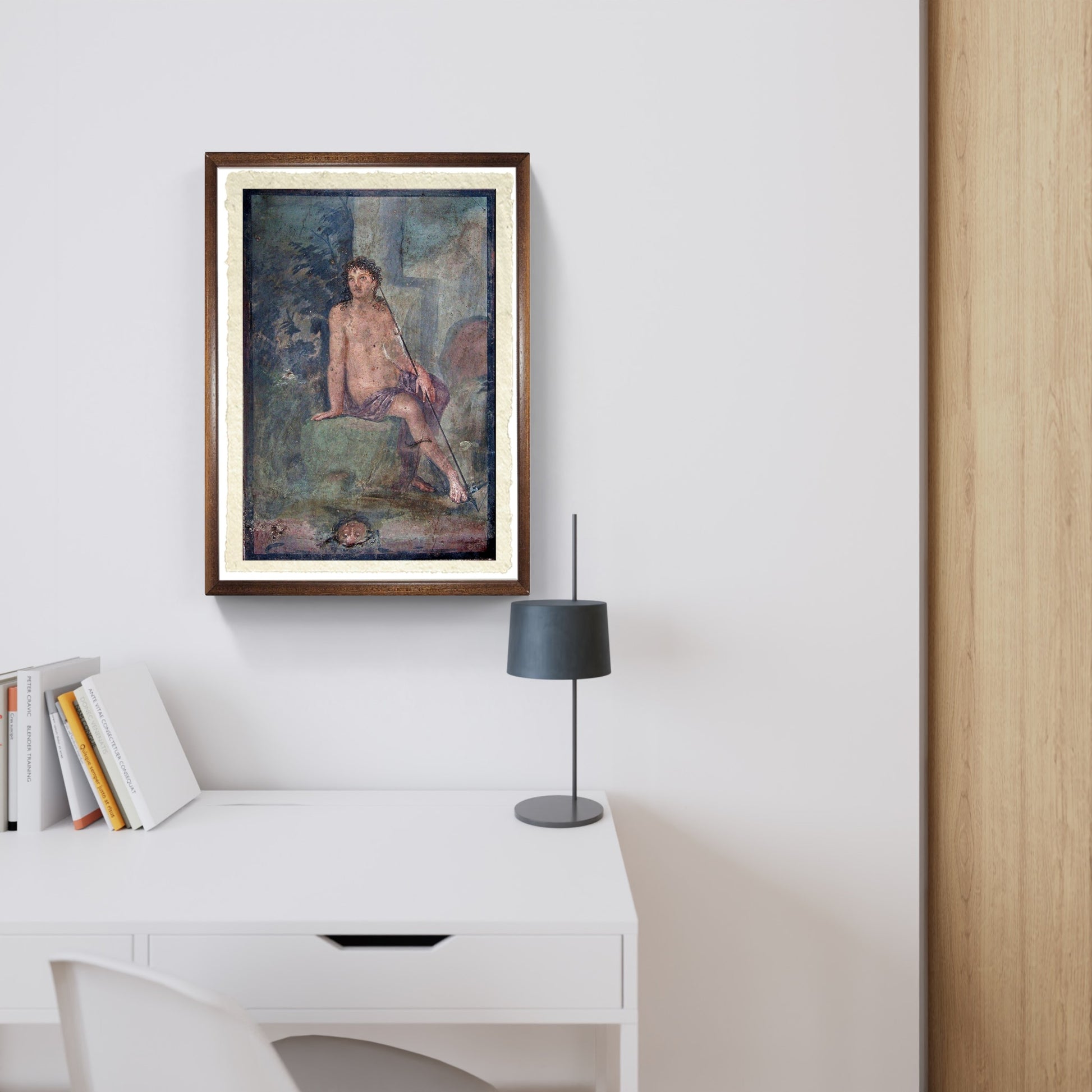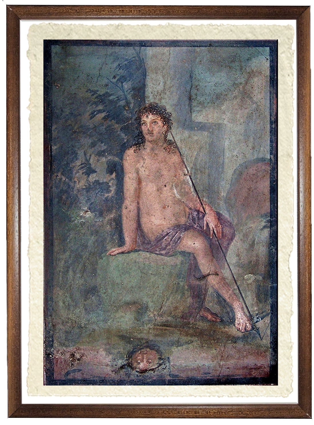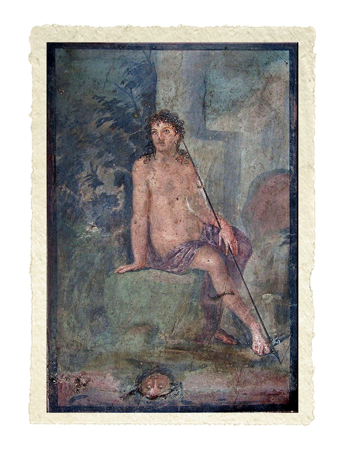 L'affresco di Narciso, scoperto nel 2019 nella Regio V di Pompei, raffigura il giovane mitologico mentre contempla il proprio riflesso in una pozza d'acqua, secondo l'iconografia classica. Questo dipinto, situato nell'atrio della stessa domus che ospita l'affresco di Leda e il cigno, è caratterizzato da colori vividi e dettagli raffinati, come ornamenti floreali, grifoni con cornucopie, amorini volanti e scene di lotte tra animali. La decorazione lussuosa dell'ambiente, probabilmente risalente agli ultimi anni della colonia, testimonia la diffusione dei miti greci nella cultura romana e l'apprezzamento per la bellezza e la vanità.