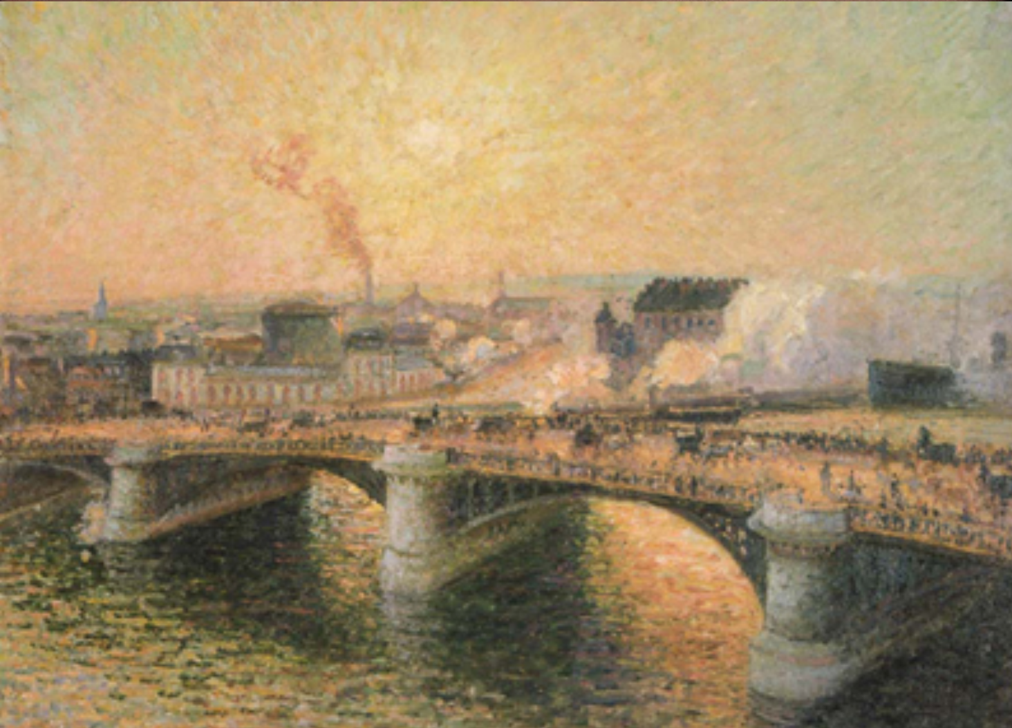 Il Ponte Boieldieu a Rouen, sole al tramonto, tempo brumoso di Camille Pissarro su pregiata carta Amalfi