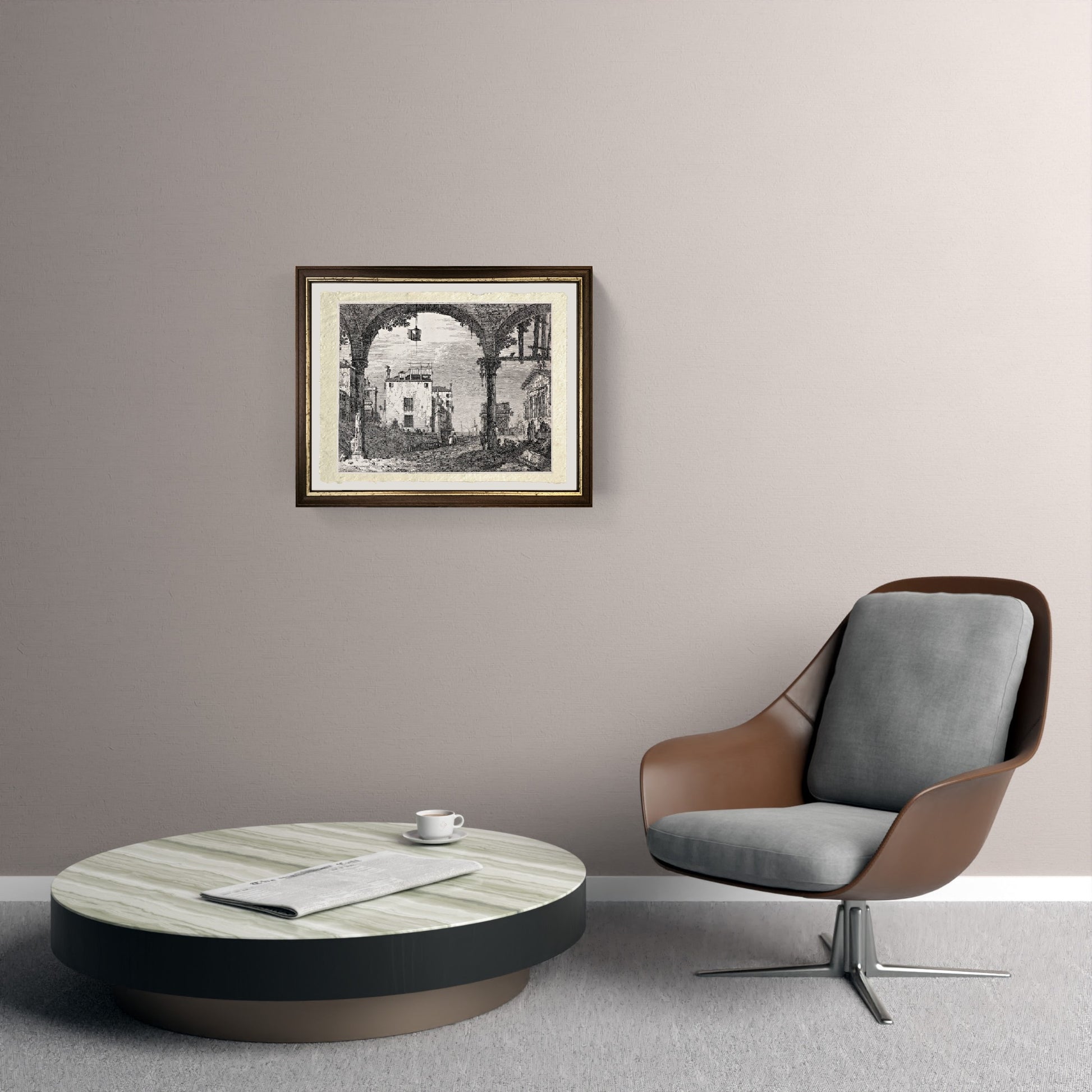 Originale e rara incisione di un portico con lanterna realizzata da Giovanni Antonio Canal detto Canaletto. In primo piano troviamo il porticato, con nella colonna centrale, una lanterna, che scende in alto dal centro della volta. Sotto il colonnato vi è rappresentata una strada, mentre più sullo sfondo troviamo delle abitazioni. Sul lato destro, vi è una porzione di un tempio romanico. Il cielo è sereno con qualche nuvola all'orizzonte.