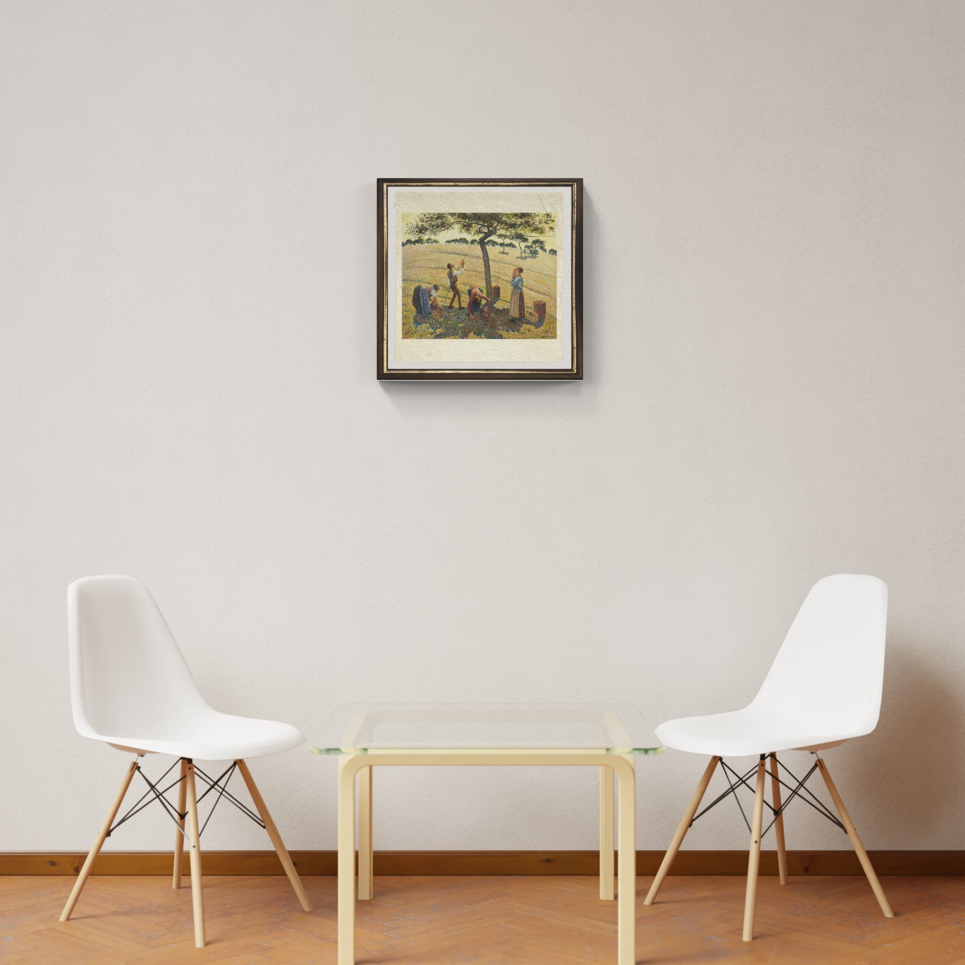 In "La raccolta delle mele, Éragny", Camille Pissarro cattura con straordinaria sensibilità un momento di vita contadina, immerso nella quiete della campagna normanna. Al centro della scena, alcune figure femminili sono intente a raccogliere mele, chine tra i rami e l’erba, colte in un gesto quotidiano che l’artista rende poetico e senza tempo. Il villaggio di Éragny, dove Pissarro visse a lungo, fa da sfondo discreto ma presente, testimone silenzioso di una realtà semplice e autentica.