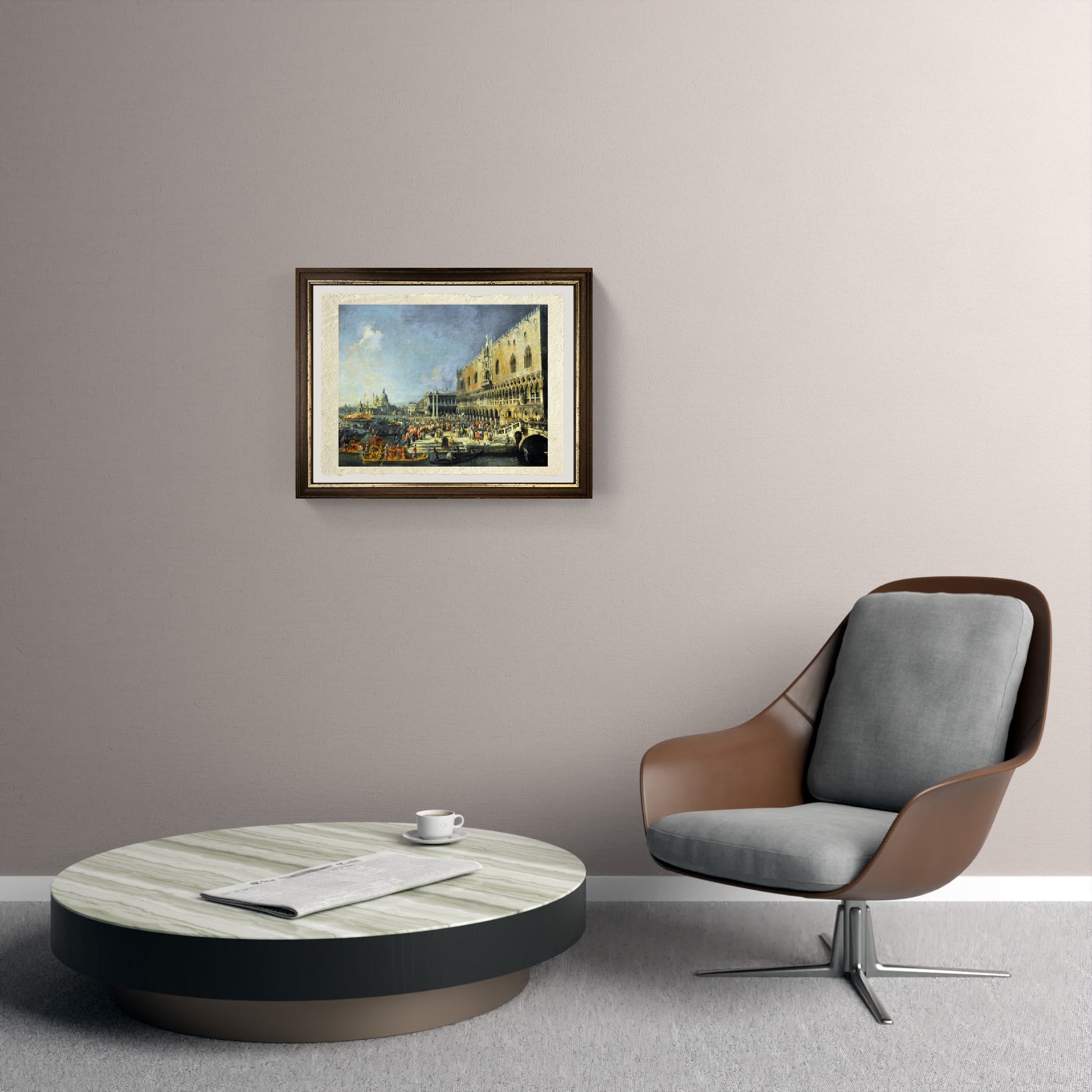 Originale e rara rappresentazione settecentesca di un ricevimento dell'ambasciatore di Francia a Venezia, realizzata da Giovanni Antonio Canal detto Canaletto. Particolare del dipinto la piazzetta difronte al palazzo Ducale, con le navi ancorate e la folla di nobili venuti per portare il loro saluto al nuovo ambasciatore che si insedia nella città di Venezia. Più sullo sfondo si possono ammirare le colonne di San Marco e San Teodoro e la cupola della chiesa di San Maria della Salute. Il cielo è nuvoloso, con delle nuvole minacciose di pioggia. Il quadro, un olio su tela, non è datato. Esistono alcune varianti create dal Canaletto di questo dipinto.