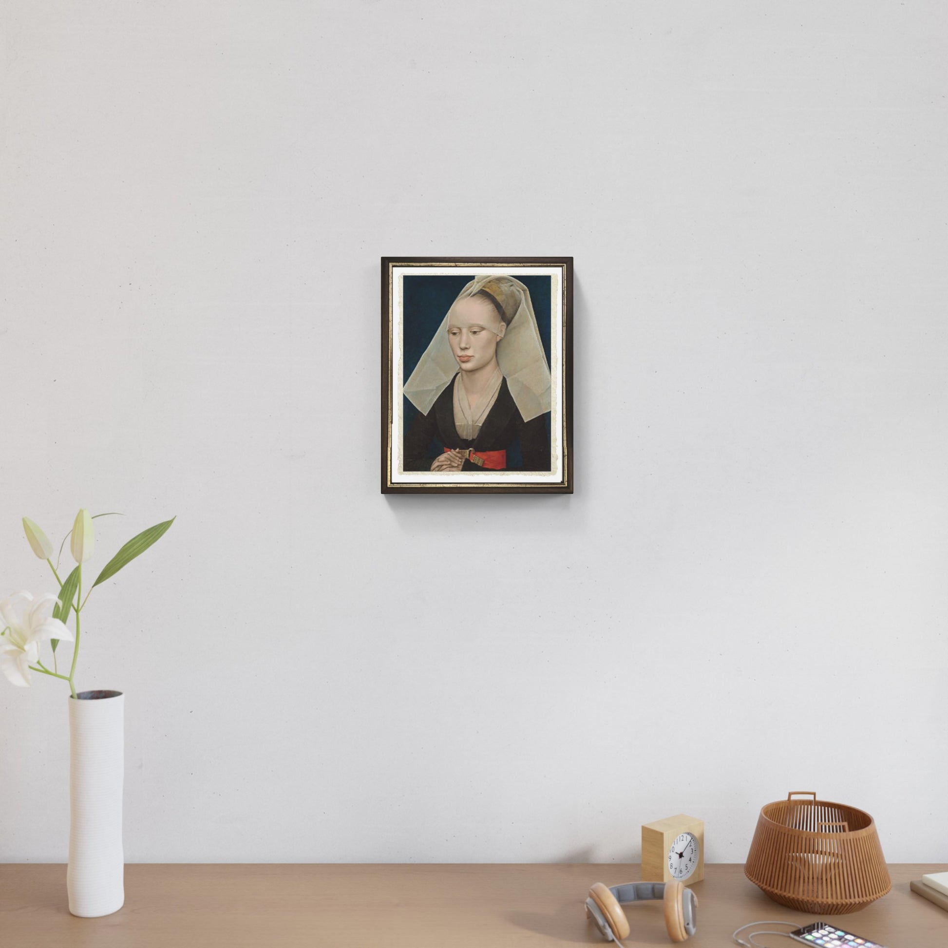 Il Ritratto di giovane donna di Rogier van der Weyden, realizzato intorno al 1460, è uno dei più raffinati esempi della ritrattistica fiamminga del Quattrocento. L’opera raffigura una giovane donna dalle mani giunte e dallo sguardo assorto, immersa in un’atmosfera di silenziosa introspezione. Van der Weyden, maestro di eleganza e sensibilità psicologica, costruisce la figura con linee pure e un equilibrio compositivo perfetto. Il volto delicato, la pelle chiarissima e il velo trasparente che incornicia la testa evidenziano la grazia e la modestia della protagonista, probabilmente appartenente all’alta borghesia fiamminga.