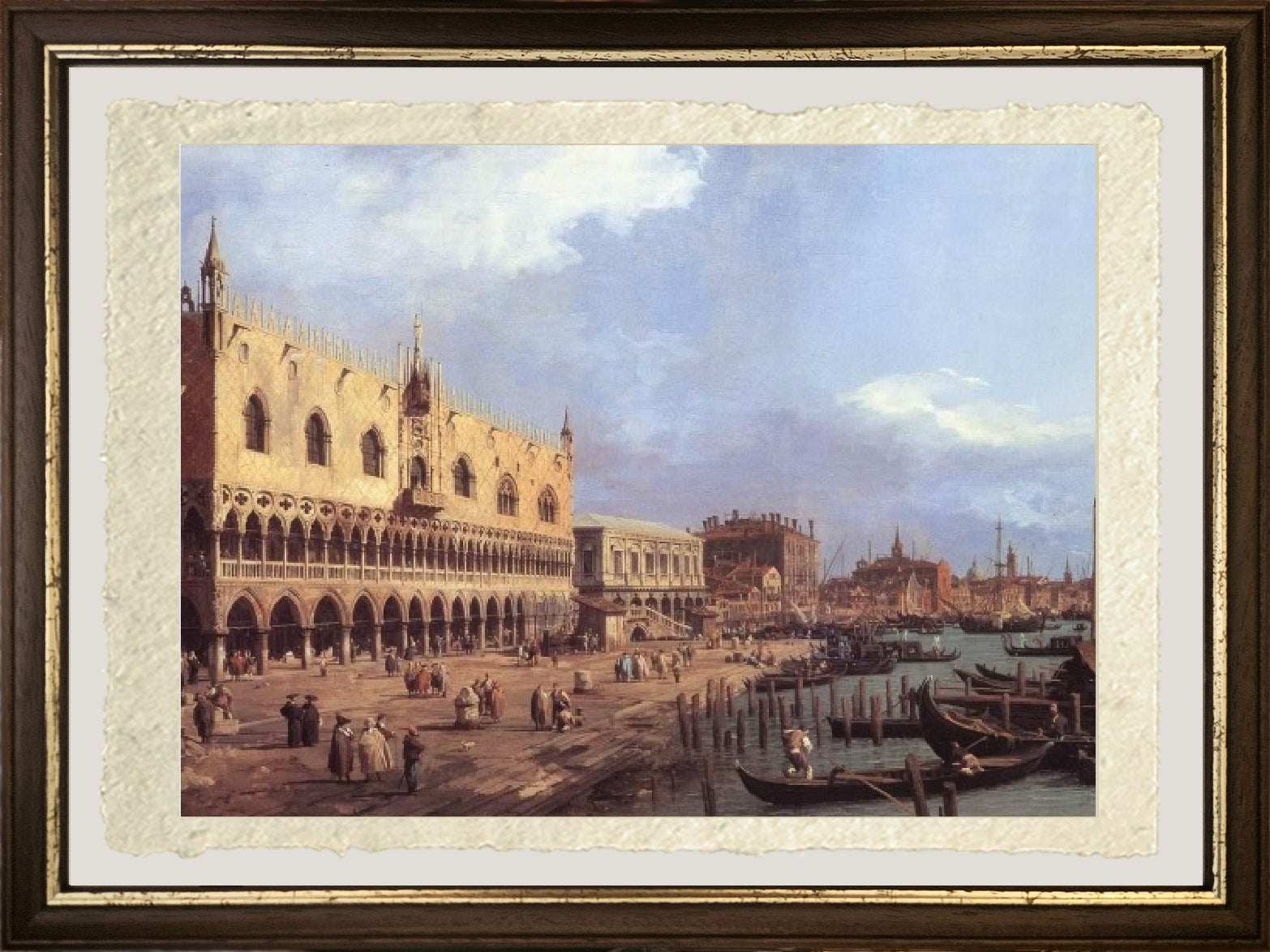 Originale e rara veduta settecentesca di riva degli Schiavoni, con particolare di alcuni palazzi antistanti, realizzata da Giovanni Antonio Canal detto Canaletto. In primo piano troviamo la banchina di riva degli Schiavoni, trafficata di gente, ed utilizzata come molo di approdo per le imbarcazioni più piccole, tra le quali le gondole. Domina la scena il palazzo Ducale, disposto lateralmente e seguito lungo la riva degli schiavoni da altri palazzi. Il cielo è leggermente nuvoloso, sfumato con azzurro chiaro e bianco per le nuvole.