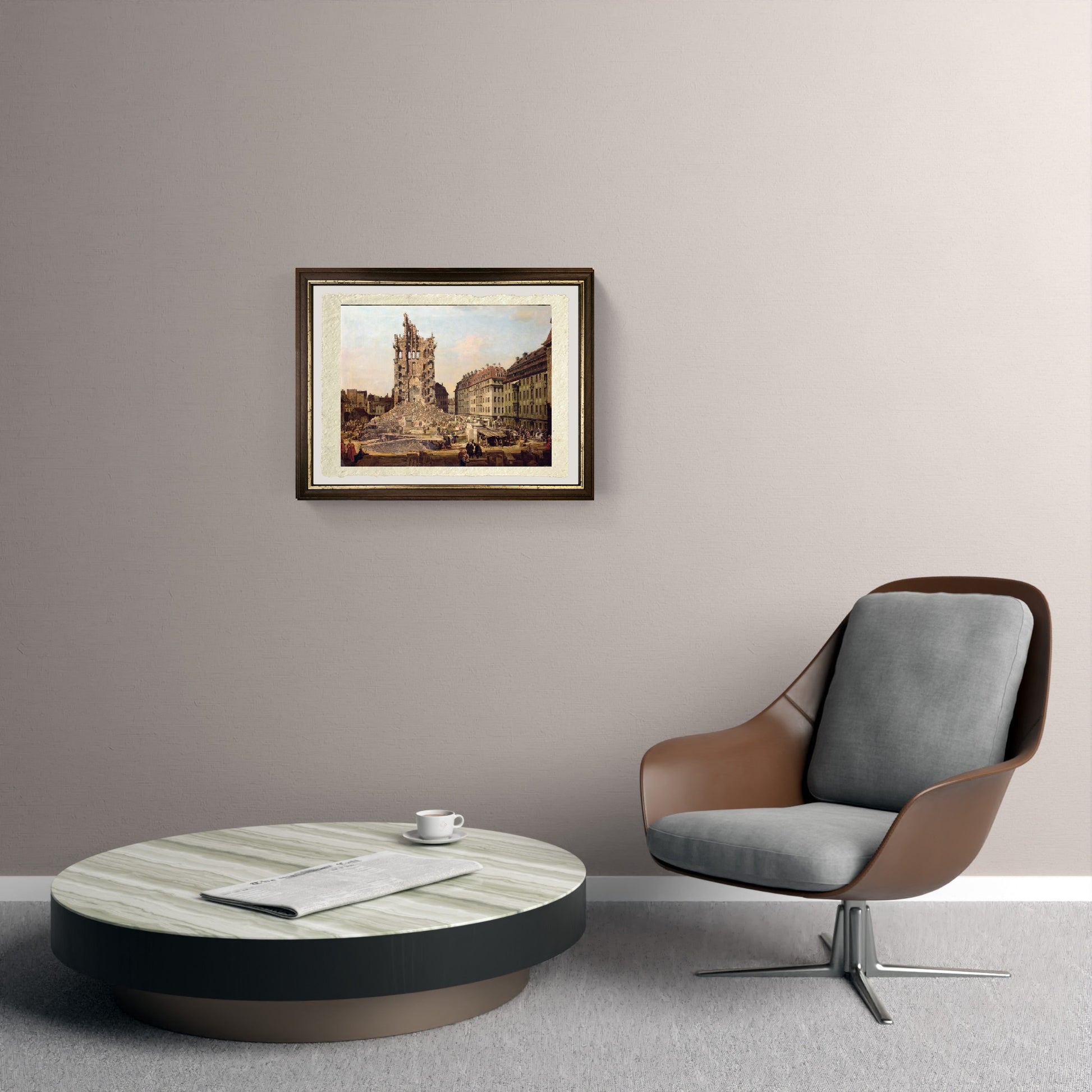 Storica e chiara veduta delle rovine della chiesa Kreuzkirche di Dresda, realizzata da Bernardo Bellotto. In evidenza troviamo l'alta chiesa in stile gotico, in rovina, con il cantiere degli operai per la raccolta dei blocchi di pietra riutilizzabili. Sul lato destro ci sono dei palazzi schierati che guardano la piazza.