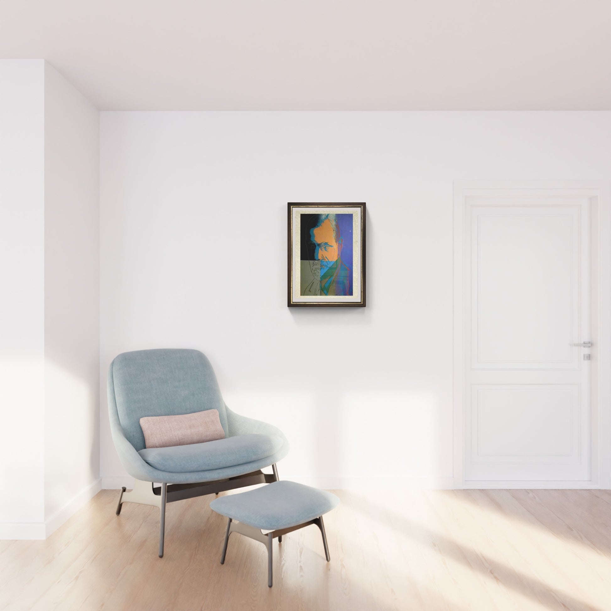 Il ritratto di Sigmund Freud realizzato da Andy Warhol negli anni ’80 fa parte della serie dedicata a figure storiche e intellettuali che hanno segnato il pensiero moderno. Warhol utilizza la tecnica serigrafica per reinterpretare il volto di Freud attraverso colori intensi e contrasti marcati, che spezzano l’austerità tipica delle sue fotografie più note. Le linee del viso, ridotte a tratti essenziali, accentuano lo sguardo penetrante e la postura severa, mentre lo sfondo cromatico enfatizza il carattere enigmatico del personaggio.