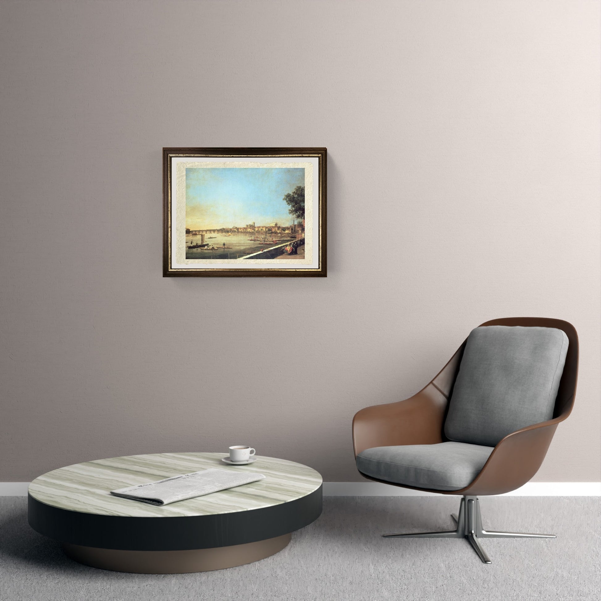 Originale e luminosa veduta settecentesca del Ponte di Westminster di Londra, realizzata da Giovanni Antonio Canal detto Canaletto. In evidenza troviamo il grande fiume, con molte barche, alcune a riva, altre che stanno navigando. Più sullo sfondo troviamo iI ponte con le sue 15 arcate che collega le due sponde del Tamigi. Sul lato destro vi è la terrazza di Somerset House, punto di vista del paesaggio, passeggiata da una famiglia. In lontananza, sempre sul lato destro si può notare una porzione di Londra del settecento.
