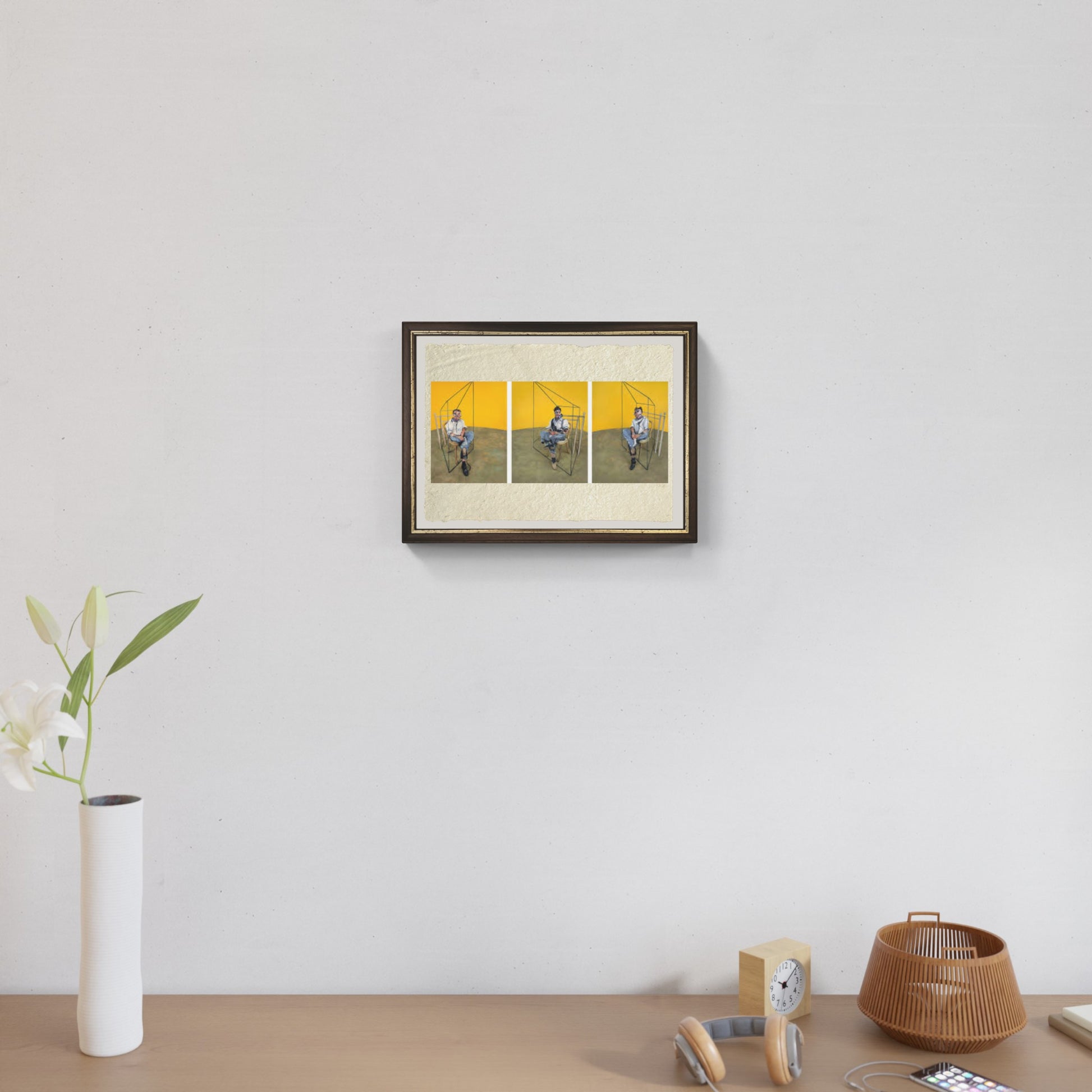 Three Studies of Lucian Freud è un trittico del 1969 in olio su tela, raffigurante il pittore Lucian Freud — amico e collega di Bacon. Nei tre pannelli, Freud appare seduto su una sedia, racchiuso in una sorta di “gabbia” visiva: lo spazio è frammentato, vuoto e claustrofobico, su un pavimento marmorizzato e uno sfondo arancione intenso. La figura è resa con la deformazione tipica di Bacon: tratti scomposti, carne tesa, postura instabile, come se il soggetto fosse sospeso tra coscienza e disgregazione.