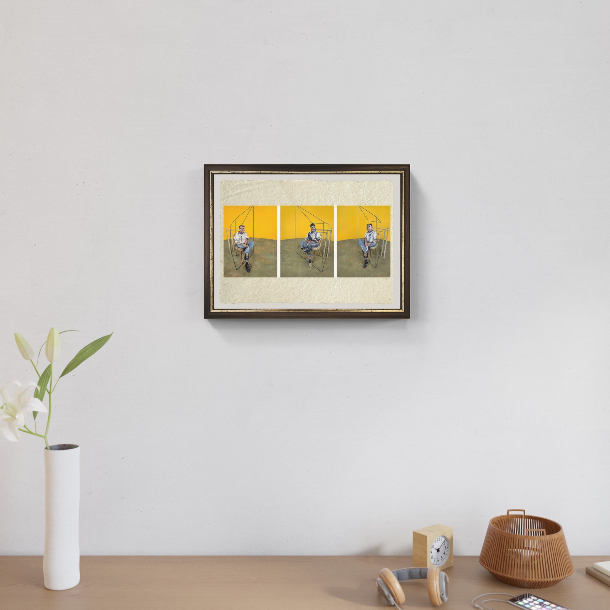 Tre studi di Lucian Freud (Three Studies of Lucian Freud) è un trittico del 1969 in olio su tela, raffigurante il pittore Lucian Freud, amico e collega di Bacon. Nei tre pannelli, Freud appare seduto su una sedia, racchiuso in una sorta di “gabbia” visiva: lo spazio è frammentato, vuoto e claustrofobico, su un pavimento marmorizzato e uno sfondo giallo intenso. La figura è resa con la deformazione tipica di Bacon: tratti scomposti, carne tesa, postura instabile, come se il soggetto fosse sospeso tra coscienza e disgregazione.