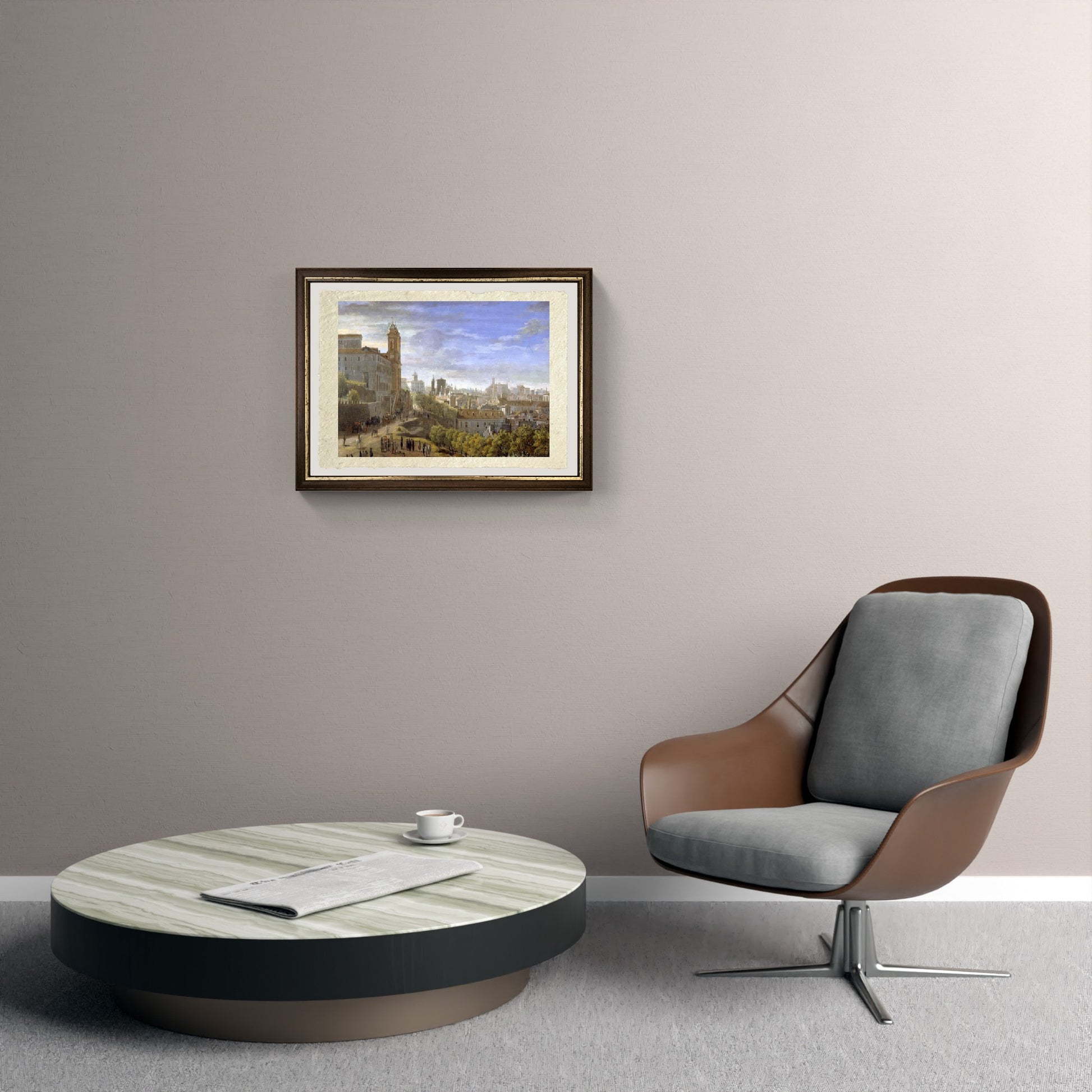 Luminosa e chiara veduta storica di Trinità dei monti in Roma, realizzata da Gaspare Vanvitelli. In evidenza vi è il palazzo arroccato con particolare di pellegrini che si accingono e salgono lo scalinato. Sullo sfondo sono raffigurati altri palazzi romani, alcuni dei quali illuminati da una luce intensa. Mentre sul lato destro si può distinguere un viale alberato. Il cielo plumbeo sovrasta la scena con tonalità intense di blu e poche nuvole appena impercettibili.