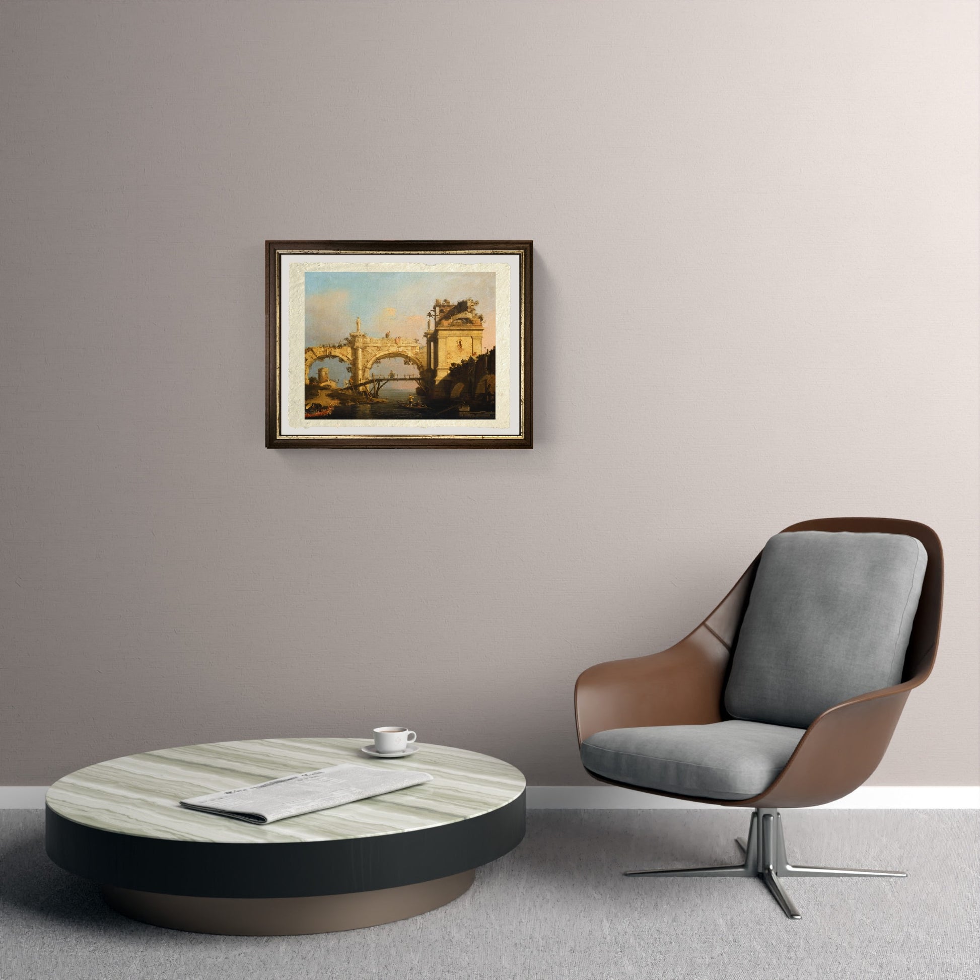 Rara settecentesca raffigurazione di un capriccio di un'arcata rinascimentale di un monumento in rovina, realizzata da Giovanni Antonio Canal detto il Canaletto. In evidenza l'arcata doppia, illuminata da un sole al tramonto, con sopra di essa una signora che stende i panni. Sotto l'arcata, scorre un fiume, attraversato da un'imbarcazione. Le due rive del fiume sono unite da un ponte precario. Più sul lato destro sono raffigurati i resti di un palazzo in rovina. Il cielo è sereno con qualche nuvola sfumata di rosa all'orizzonte. Il quadro, un olio su tela, non è datato.
