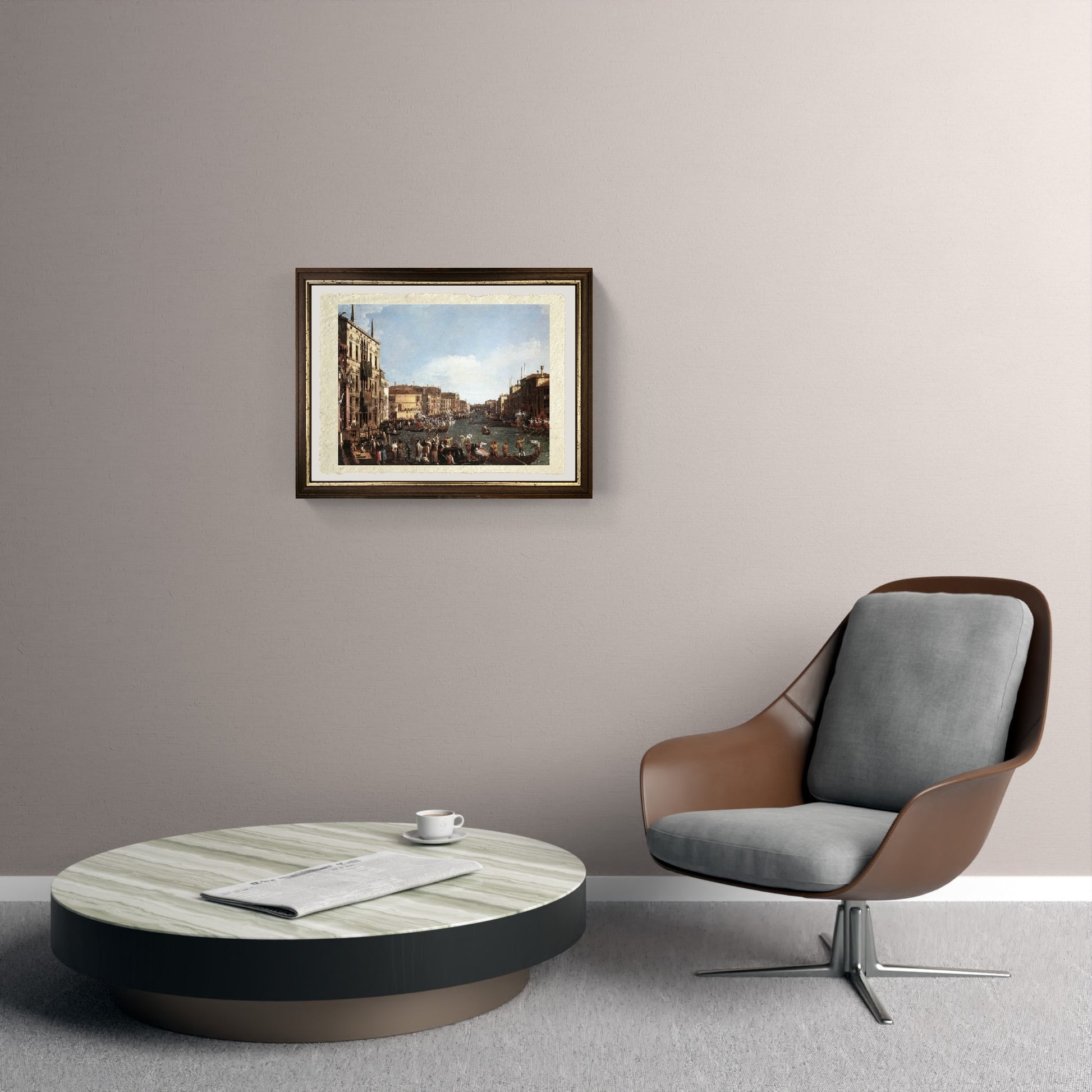 Originale e luminosa settecentesca veduta del Canal Grande con in corso una regata, realizzata da Giovanni Antonio Canal. Siamo nel giorno del redentore, tutta Venezia è in festa, ed il Canal Grande è pieno d'imbarcazioni colorate. Il cielo è sereno, in primo piano al centro del Canal Grande, la competizione tra i gondolini. Il cielo è sereno, la giornata è ideale per la festa. Il quadro, un olio su tela, è datato circa 1732. Esistono numerose varianti dipinte dal Canal di questo dipinto.