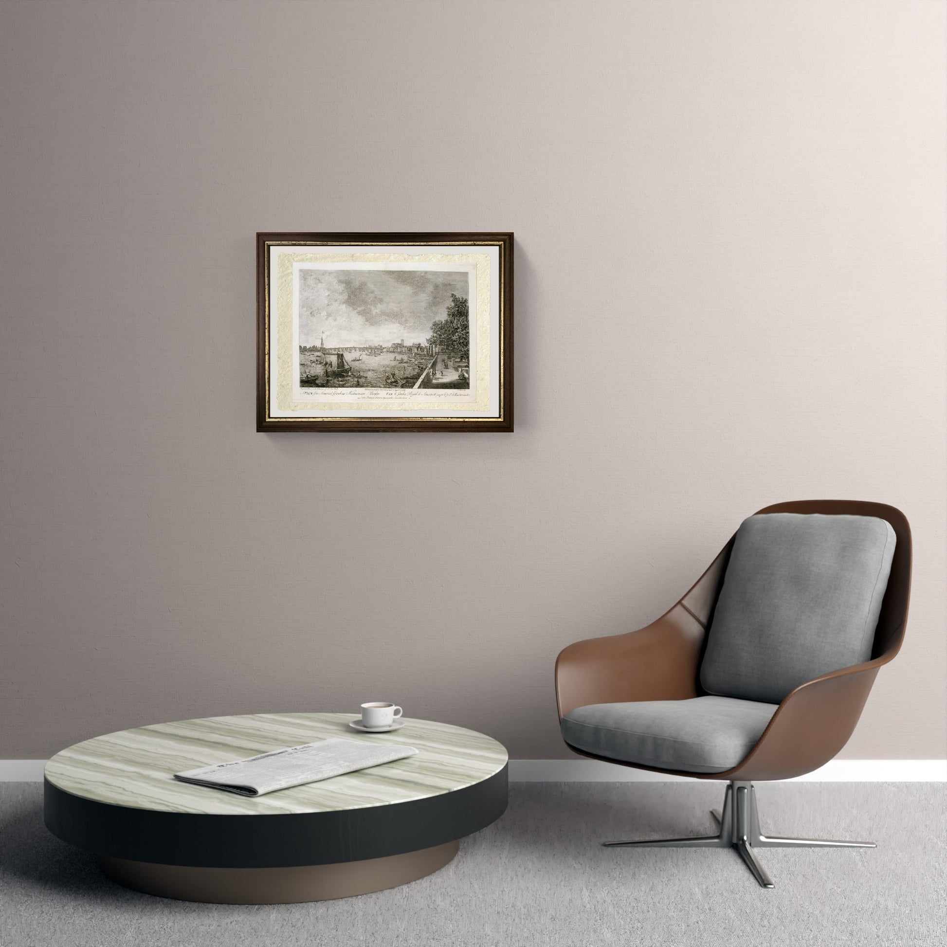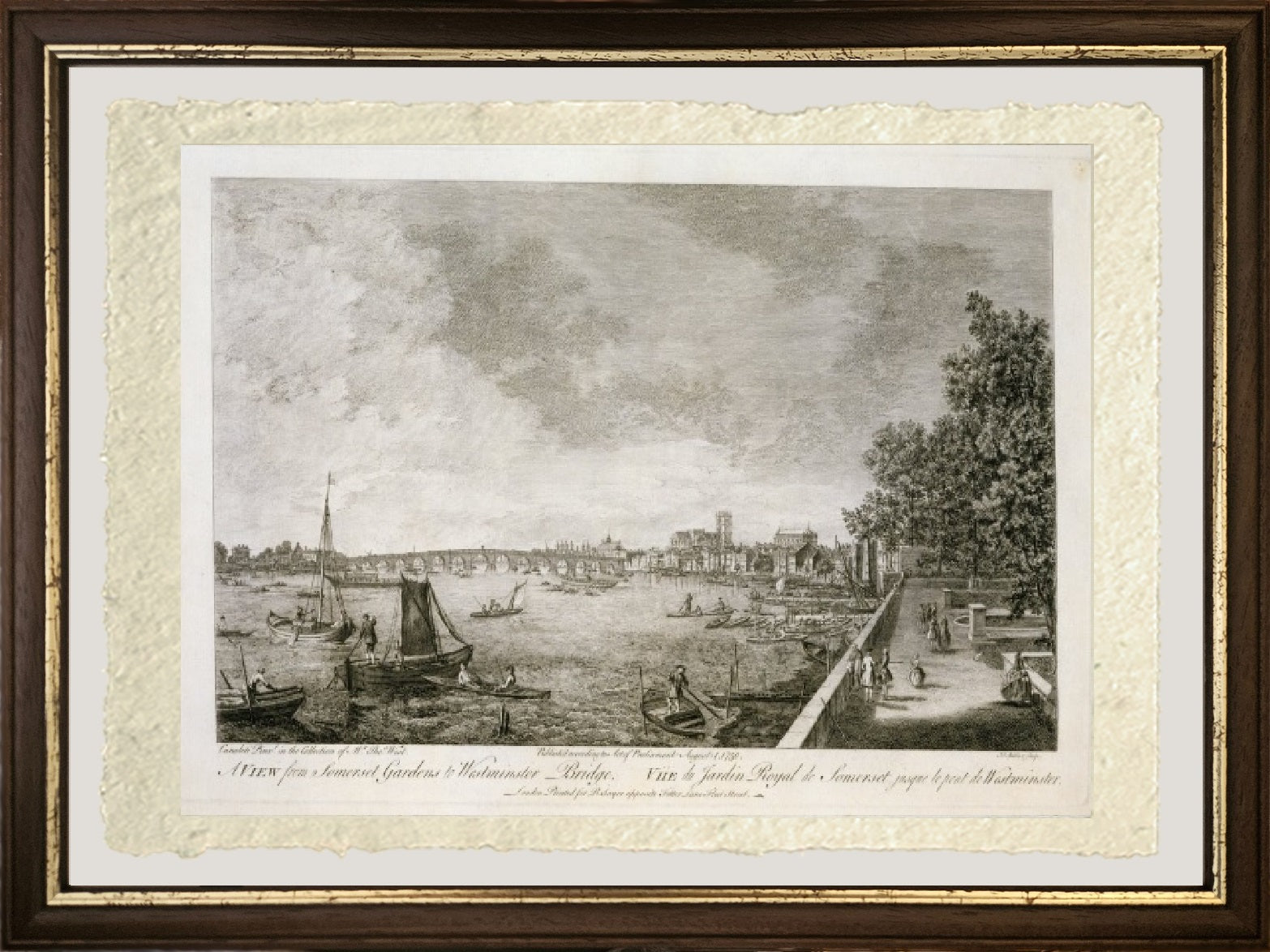 Originale e rara incisione raffigurante i giardini di Somerset vicini al ponte di Westminster, realizzata da Giovanni Antonio Canal detto Canaletto. In primo piano sul lato destro un dettaglio dei giardini, con grandi viali ed alcuni cittadini che vi passeggiano. Il lato sinistro invece vede raffigurato il Tamigi, navigato da alcune imbarcazioni di varia grandezza, con sullo sfondo il ponte di Westminster. Il cielo è nuvoloso, ci sono delle oscure nubi all'orizzonte, specie nel lato destro dell'opera. L'incisione è datata 1750.