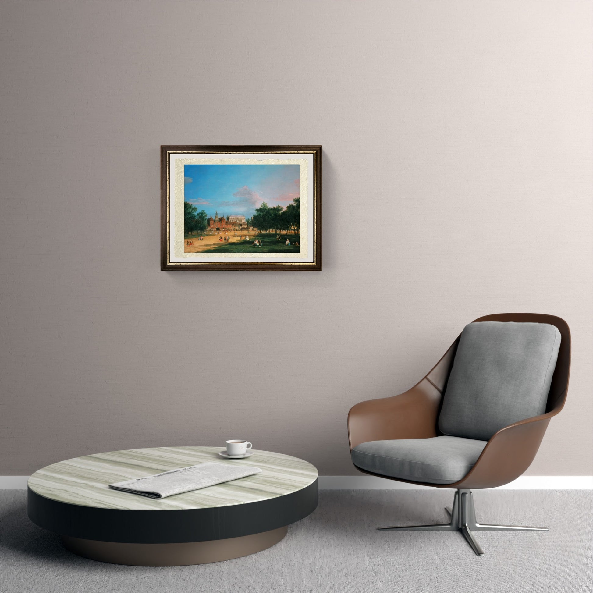 Originale e luminosa rappresentazione settecentesca dei palazzi di Vecchi Horse Guards e la Banqueting Hall di Londra, realizzata da Giovanni Antonio Canal detto Canaletto. In primo piano troviamo il grande giardino all'inglese, popolato di nobili e dame con scene di vita quotidiana. Più sullo sfondo possiamo osservare i due palazzi del Vecchi Horse Guards e la Banqueting Hall, in stile architettonico anglosassone. Ai lati del giardino, Canaletto dipinge dei viali alberati. Il cielo è sereno, ma c'è qualche nuvola rosa sull'orizzonte al tramonto.