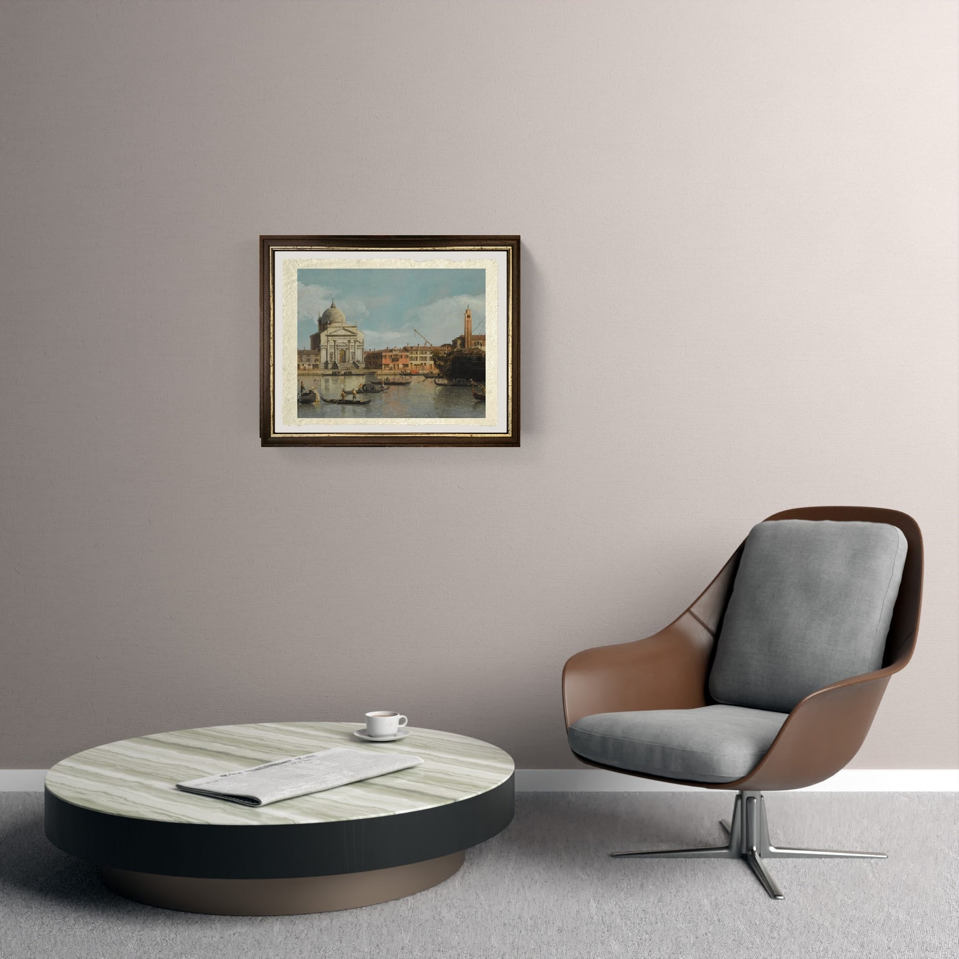 Originale e rara veduta settecentesca della chiesa del Redentore e di quella di San Giacomo, realizzata da Giovanni Antonio Canal detto Canaletto. In primo piano sul lato sinistro troviamo la Chiesa del Redentore che si affaccia sul Canal Grande con la sua bella cupola e la scalinata. Mentre la chiesa di San Giacomo sul lato destro è "oscurata" da un veliero che sta navigando. L'acqua del canale è stata dipinta con sfumature di verde chiaro azzurro. Tra le due chiese vi sono i palazzi di Venezia, disposti affiancati.