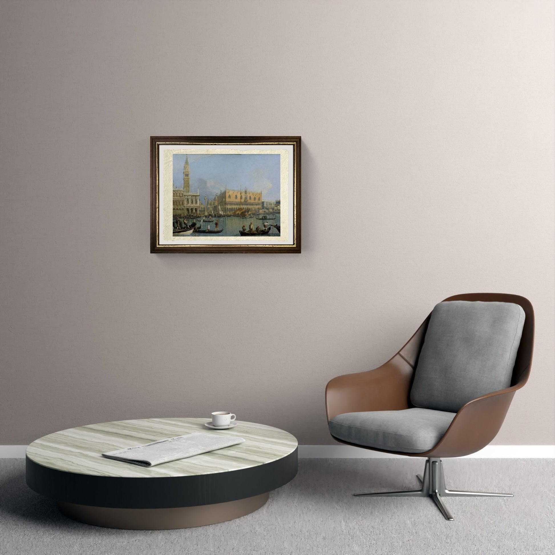 Originale e luminosa settecentesca veduta di Palazzo Ducale, vista dal Canal Grande, realizzata da Giovanni Antonio Canal detto Canaletto. In primo piano alcune imbarcazioni che stanno navigando nel Canal Grande, mentre più sullo sfondo si possono notare il campanile di San Marco con lo splendido palazzo Ducale. In evidenza anche le due colonne di San Teodoro e San Marco. L'acqua del canale, in cui si specchia il palazzo Ducale, è sfumata con verde chiaro azzurro. Il cielo è leggermente nuvoloso, con qualche nuvola. Il quadro, un olio su tela, non è datato. Esistono altre due varianti create dal Canaletto di quest'opera.