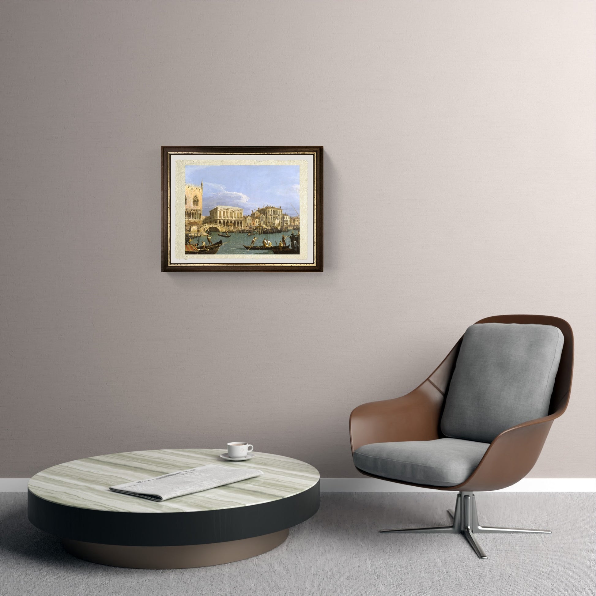 Originale e rara settecentesca veduta del Canal Grande, con particolare di riva degli Schiavoni, realizzata da Giovanni Antonio Canal detto Canaletto. In primo piano il Canal Grande, solcato da imbarcazioni di varia grandezza. L'acqua è stata dipinta dal Canal con sfumature verde chiaro azzurro. Sul Canal Grande si affacciano i palazzi veneziani. Il cielo è leggermente nuvoloso, sfumato con azzurro chiaro e bianco per le nuvole. Il quadro, un olio su tela, è datato circa 1735. Esistono altre varianti create dal Canaletto di quest'opera.