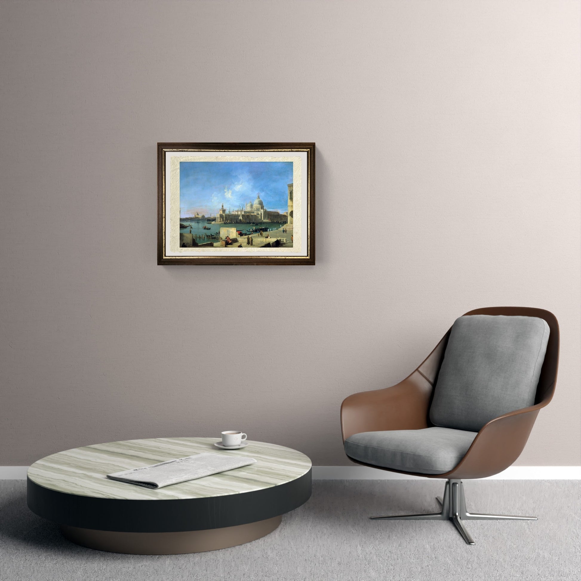 Originale e luminosa veduta della chiesa Santa Maria della Salute, realizzata da Giovanni Antonio Canal detto Canaletto, con vista dall'ingresso del Canal Grande. In primo piano la banchina del molo, con scene di vita quotidiana. Più sullo sfondo ecco punta della Dogana, con vicino la splendida chiesa di Santa Maria della Salute. Il cielo è sereno con qualche nuvola bianca all'orizzonte. Il dipinto, un olio su tela, è datata 1727. Esistono altre varianti di quest'opera.