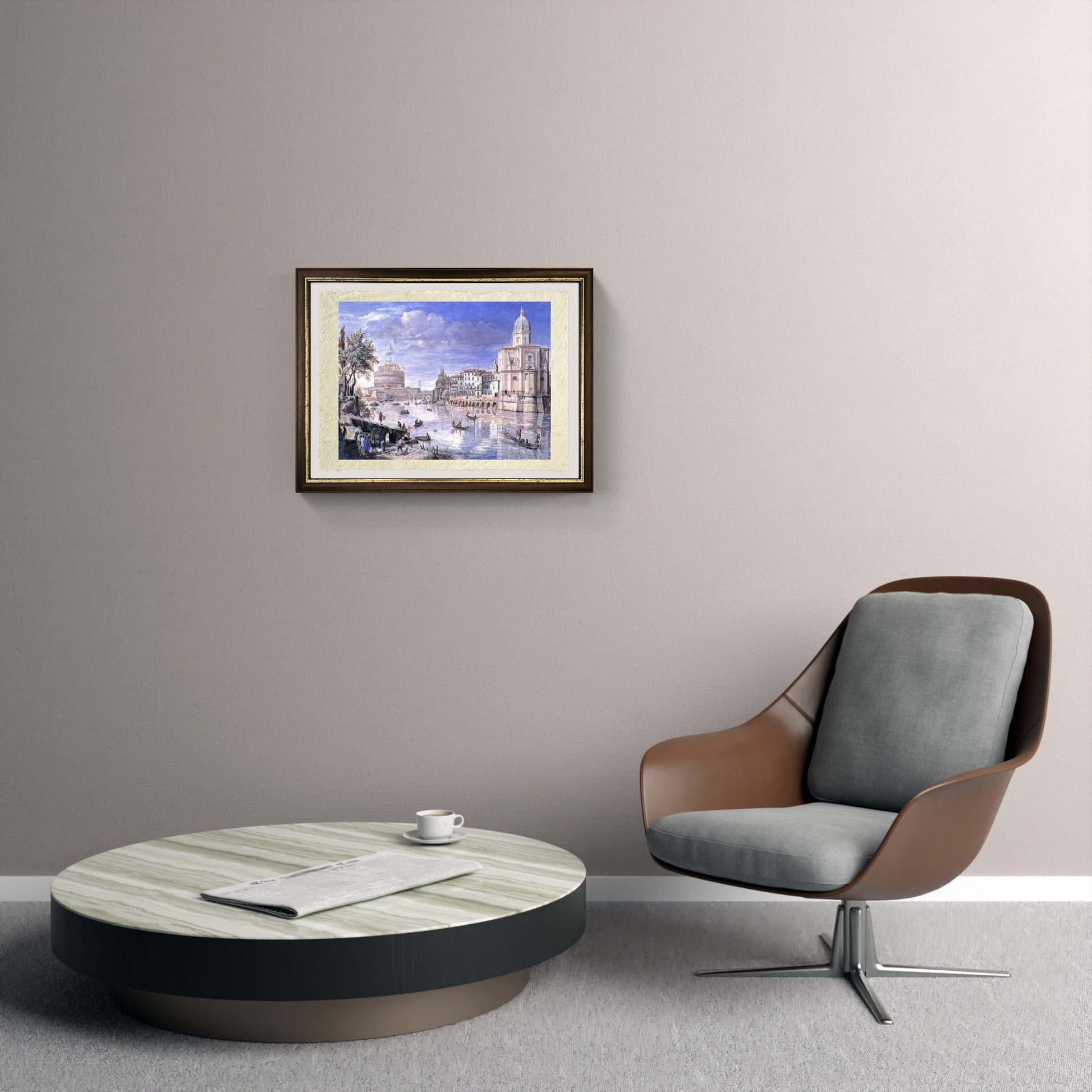 Luminosa veduta settecentesca di Roma dipinta da Gaspare Vanvitelli, con il Castel Sant'Angelo collocato sullo sfondo verso sinistra. I dettagli sono sfumati; in primo piano il Tevere è rappresentato attraversato da molte barche e con figure umane in movimento. Sul lato destro del dipinto c'è palazzo con dei caseggiati. Da notare il cambio di tonalità del cielo, visto di mattino con tonalità di azzurro e blu miste nel lato destro, mentre a sinistra colori più chiari. Il colore dominante è l'azzurro con infinite sfumature che Gaspare Vanvitelli ha creato.