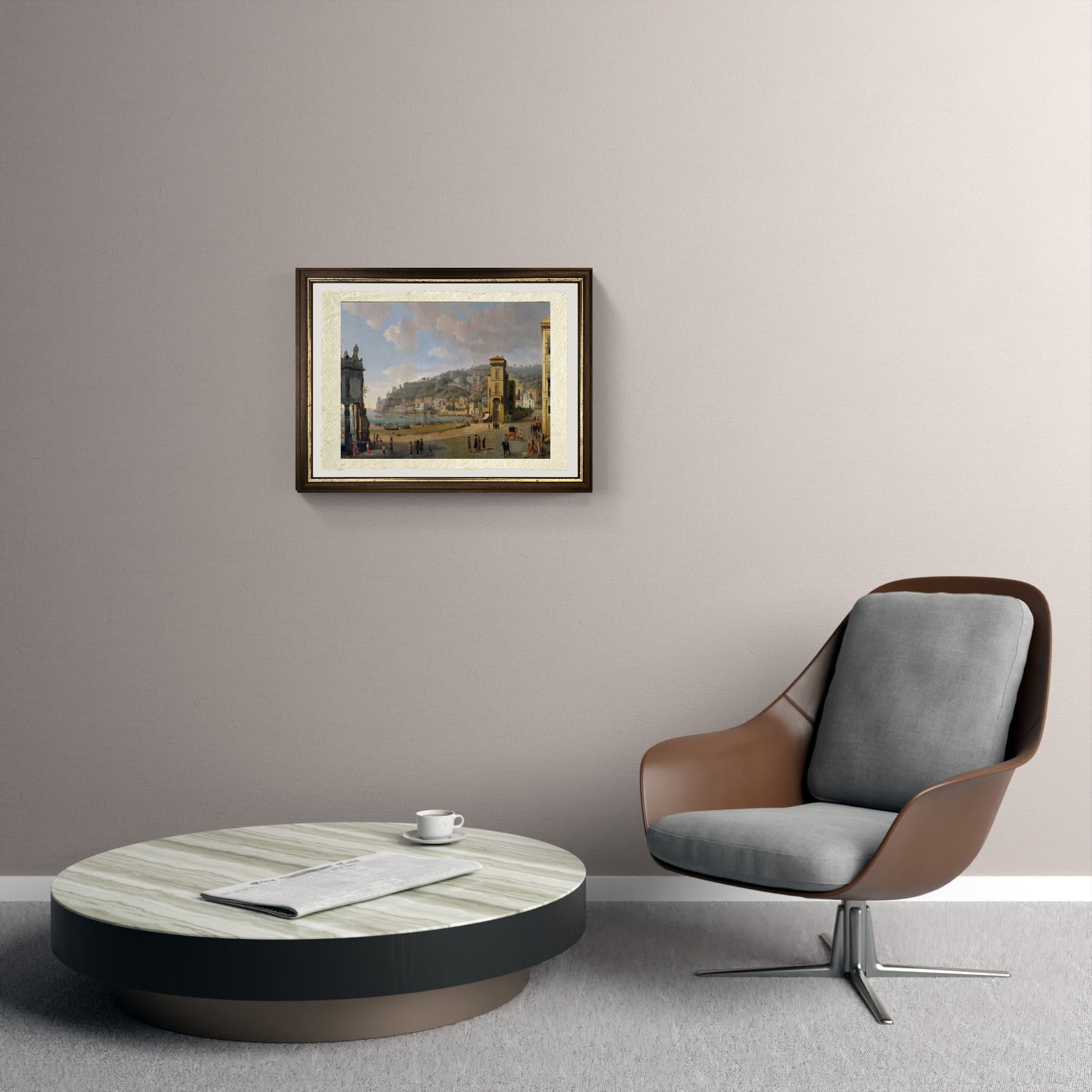 Interessante veduta di prospettiva di Napoli ambientata nel XVII° secolo eseguita da Gaspare Vanvitelli. In evidenza un particolare dell'ansa, ed uno spiazzale in cui i cittadini si incontrano. In primo piano una sezione di di un palazzo a destra, mentre verso sinistra si sviluppa il promontorio. Il cielo è leggermente nuvoloso ma il sole (non raffigurato nel quadro, perché supposto in posizione dell'osservatore) illumina il porto. Il dipinto fa parte della Galleria Palatina del Palazzo Pitti di Firenze. |